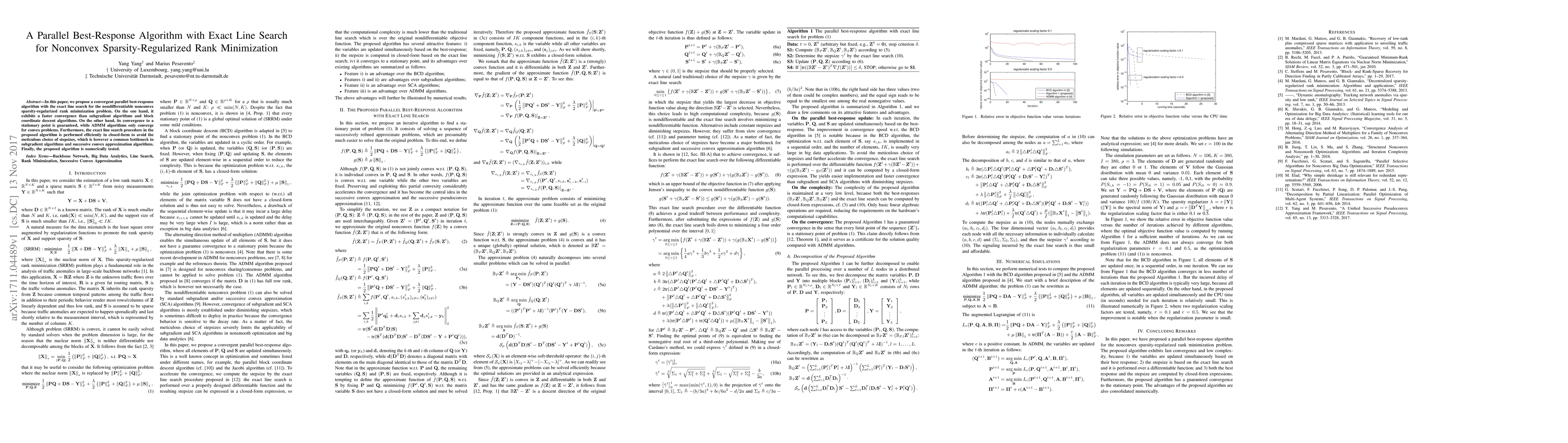 This paper introduces a parallel best-response algorithm with exact line search for solving nonconvex sparsity-regularized rank minimization problems, demonstrating faster convergence and guaranteed convergence to a stationary point compared to subgradient and ADMM methods. The exact line search is efficiently computed in closed-form to avoid stepsize selection issues.