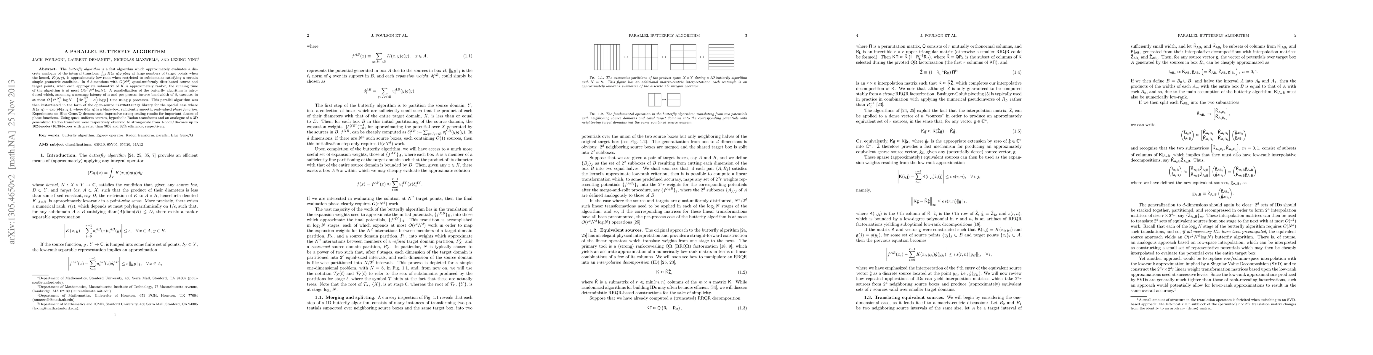The butterfly algorithm is a fast algorithm which approximately evaluates a discrete analogue of the integral transform \int K(x,y) g(y) dy at large numbers of target points when the kernel, K(x,y), is approximately low-rank when restricted to subdomains satisfying a certain simple geometric condition. In d dimensions with O(N^d) quasi-uniformly distributed source and target points, when each appropriate submatrix of K is approximately rank-r, the running time of the algorithm is at most O(r^2 N^d log N). A parallelization of the butterfly algorithm is introduced which, assuming a message latency of \alpha and per-process inverse bandwidth of \beta, executes in at most O(r^2 N^d/p log N + \beta r N^d/p + \alpha)log p) time using p processes. This parallel algorithm was then instantiated in the form of the open-source DistButterfly library for the special case where K(x,y)=exp(i \Phi(x,y)), where \Phi(x,y) is a black-box, sufficiently smooth, real-valued phase function. Experiments on Blue Gene/Q demonstrate impressive strong-scaling results for important classes of phase functions. Using quasi-uniform sources, hyperbolic Radon transforms and an analogue of a 3D generalized Radon transform were respectively observed to strong-scale from 1-node/16-cores up to 1024-nodes/16,384-cores with greater than 90% and 82% efficiency, respectively.