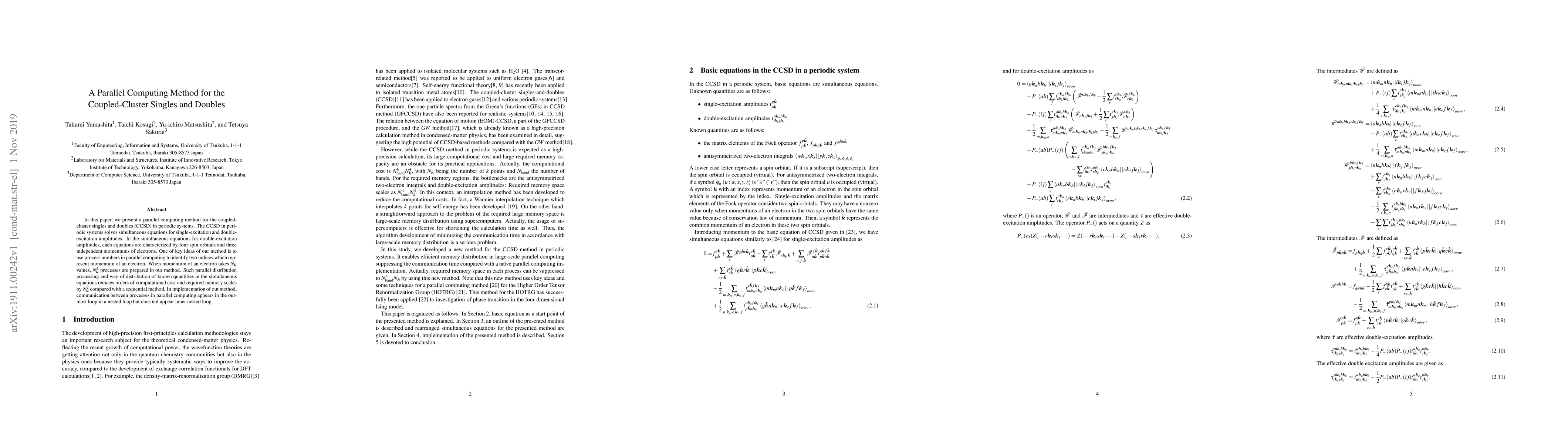 A new parallel computing method reduces computational cost by a factor of $N_{m{k}}^2$ for solving coupled-cluster singles and doubles equations in periodic systems.