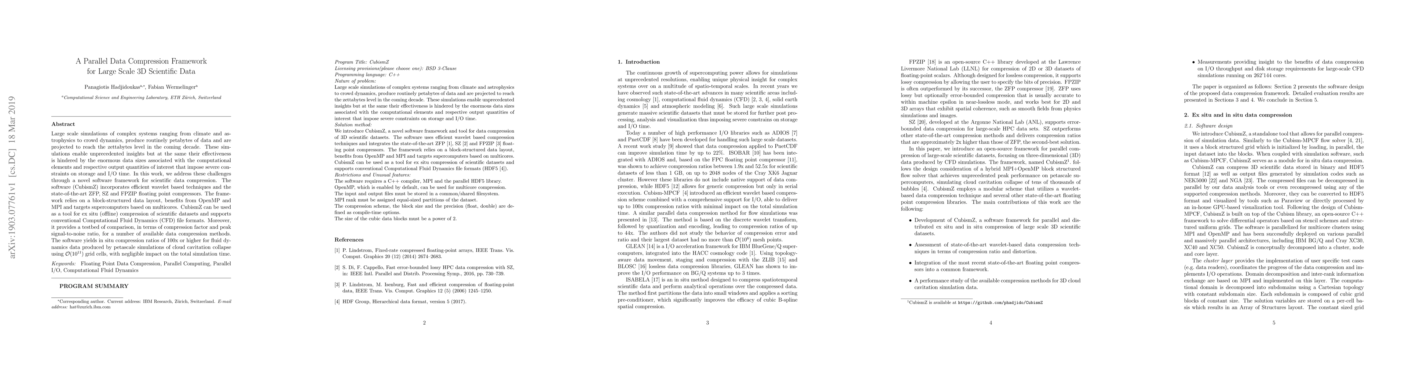 This paper introduces CubismZ, a parallel data compression framework for large-scale 3D scientific data, utilizing wavelet techniques and advanced floating point compressors to achieve in situ compression ratios of 100x or higher for petascale simulations, while maintaining minimal impact on simulation time.