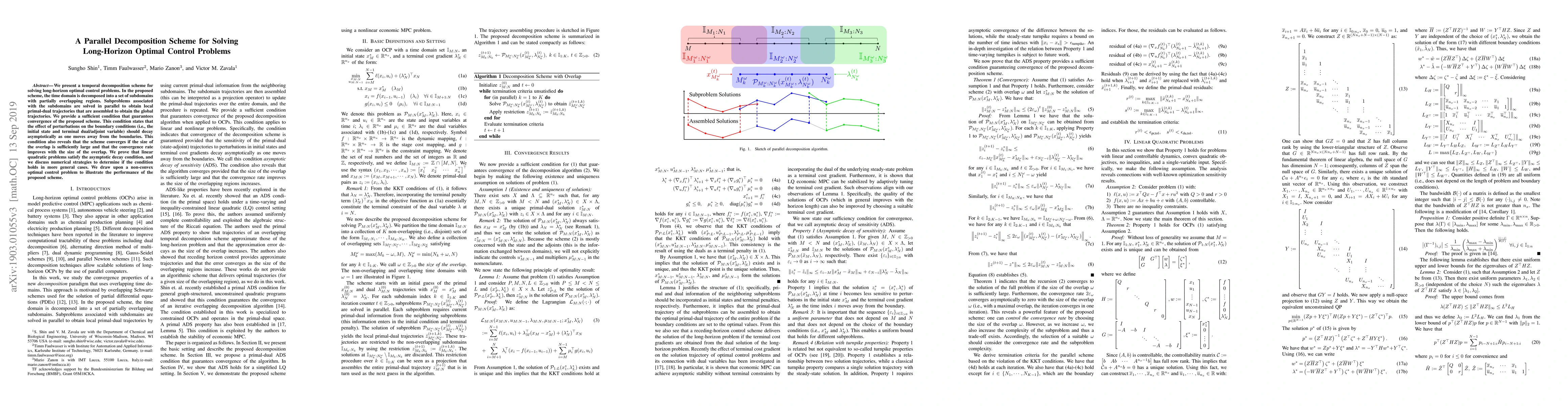 We present a temporal decomposition scheme for solving long-horizon optimal control problems. In the proposed scheme, the time domain is decomposed into a set of subdomains with partially overlapping regions. Subproblems associated with the subdomains are solved in parallel to obtain local primal-dual trajectories that are assembled to obtain the global trajectories. We provide a sufficient condition that guarantees convergence of the proposed scheme. This condition states that the effect of perturbations on the boundary conditions (i.e., initial state and terminal dual/adjoint variable) should decay asymptotically as one moves away from the boundaries. This condition also reveals that the scheme converges if the size of the overlap is sufficiently large and that the convergence rate improves with the size of the overlap. We prove that linear quadratic problems satisfy the asymptotic decay condition, and we discuss numerical strategies to determine if the condition holds in more general cases. We draw upon a non-convex optimal control problem to illustrate the performance of the proposed scheme.