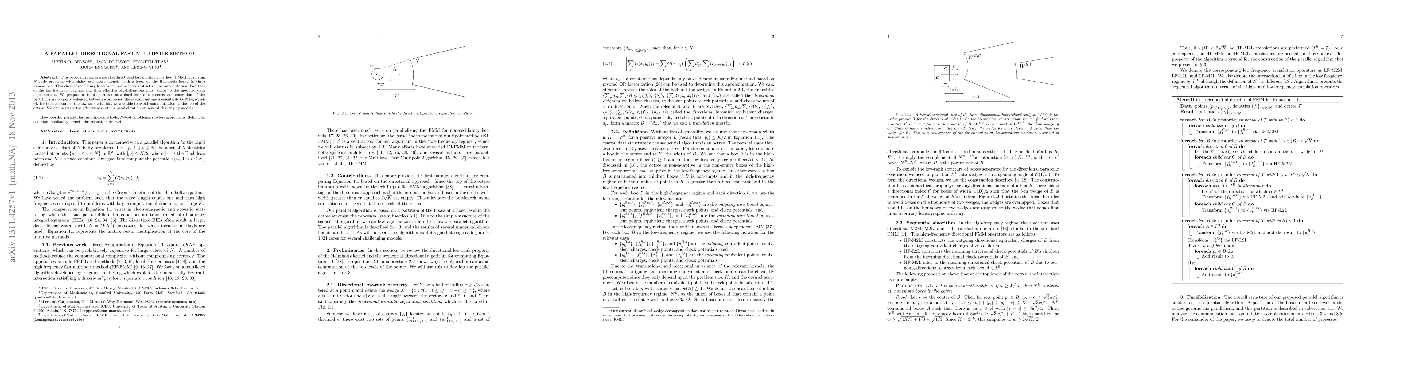 This paper presents a parallel directional fast multipole method for solving N-body problems with oscillatory kernels, particularly the Helmholtz kernel in three dimensions. The proposed method balances partitions across processes to achieve an overall runtime of O(N log N/p + p), effectively avoiding communication overhead.