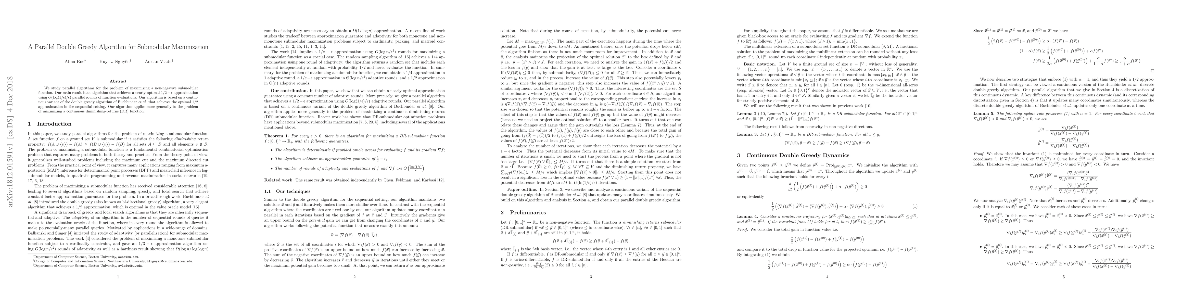 We study parallel algorithms for the problem of maximizing a non-negative submodular function. Our main result is an algorithm that achieves a nearly-optimal $1/2 -\epsilon$ approximation using $O(\log(1/\epsilon) / \epsilon)$ parallel rounds of function evaluations. Our algorithm is based on a continuous variant of the double greedy algorithm of Buchbinder et al. that achieves the optimal $1/2$ approximation in the sequential setting. Our algorithm applies more generally to the problem of maximizing a continuous diminishing-returns (DR) function.