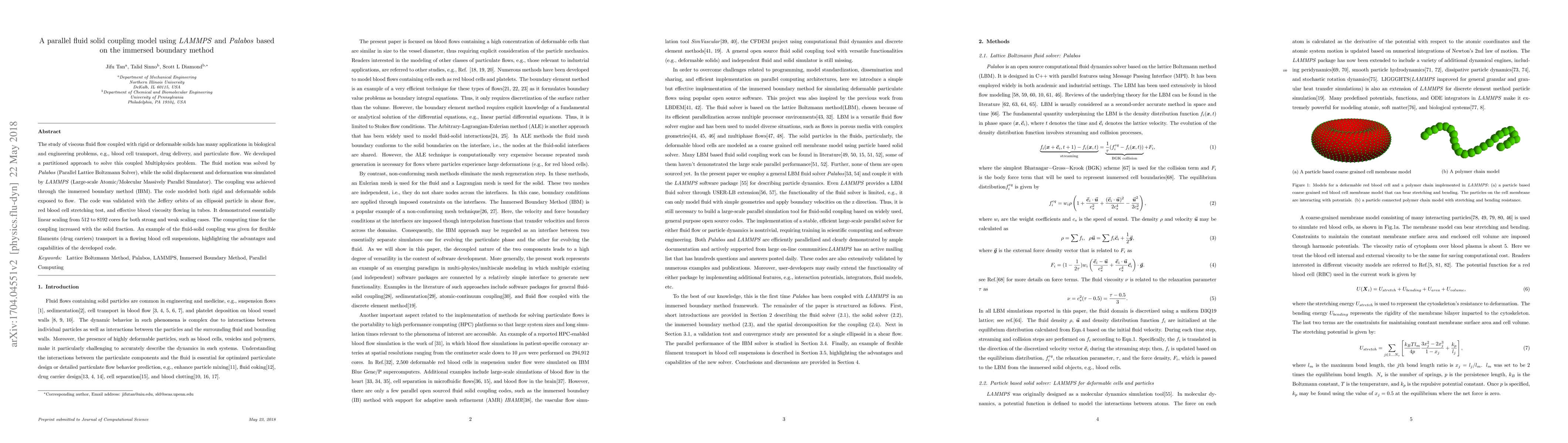 This paper presents a partitioned parallel fluid-solid coupling model using LAMMPS and Palabos, employing the immersed boundary method for applications in biological and engineering contexts. The model demonstrated linear scalability and was validated through various tests, showcasing its effectiveness in simulating flexible filaments in blood cell suspensions.