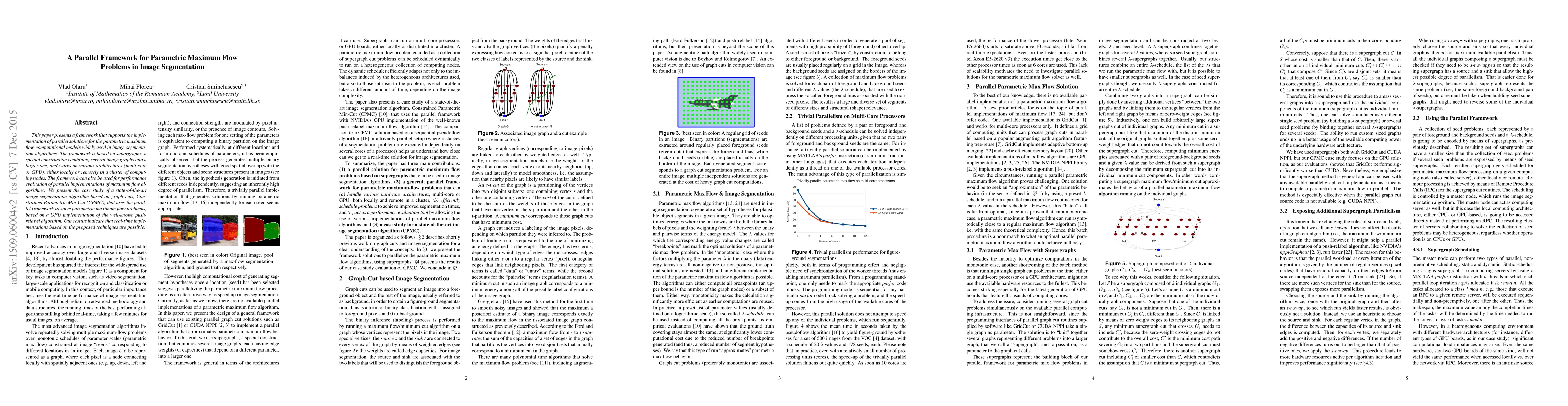 This paper introduces a parallel framework for solving parametric maximum flow problems in image segmentation, leveraging supergraphs and GPU implementations to enhance performance. The framework enables real-time solutions for state-of-the-art algorithms like Constrained Parametric Min-Cut (CPMC) on various computing architectures.