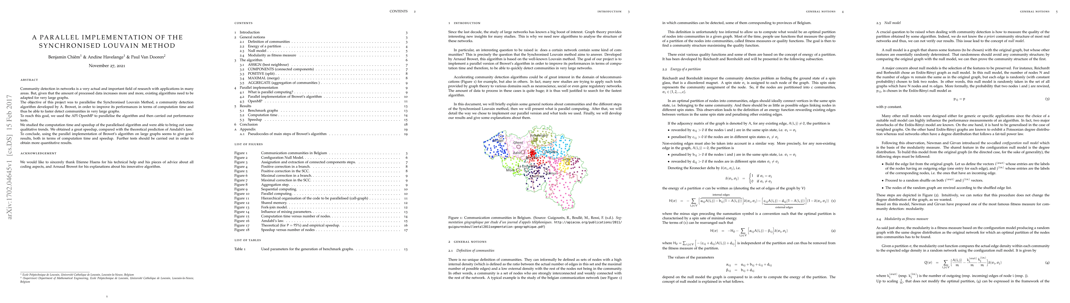 Community detection in networks is a very actual and important field of research with applications in many areas. But, given that the amount of processed data increases more and more, existing algorithms need to be adapted for very large graphs. The objective of this project was to parallelise the Synchronised Louvain Method, a community detection algorithm developed by Arnaud Browet, in order to improve its performances in terms of computation time and thus be able to faster detect communities in very large graphs. To reach this goal, we used the API OpenMP to parallelise the algorithm and then carried out performance tests. We studied the computation time and speedup of the parallelised algorithm and were able to bring out some qualitative trends. We obtained a great speedup, compared with the theoretical prediction of Amdahl law. To conclude, using the parallel implementation of the algorithm of Browet on large graphs seems to give good results, both in terms of computation time and speedup. Further tests should be carried out in order to obtain more quantitative results.