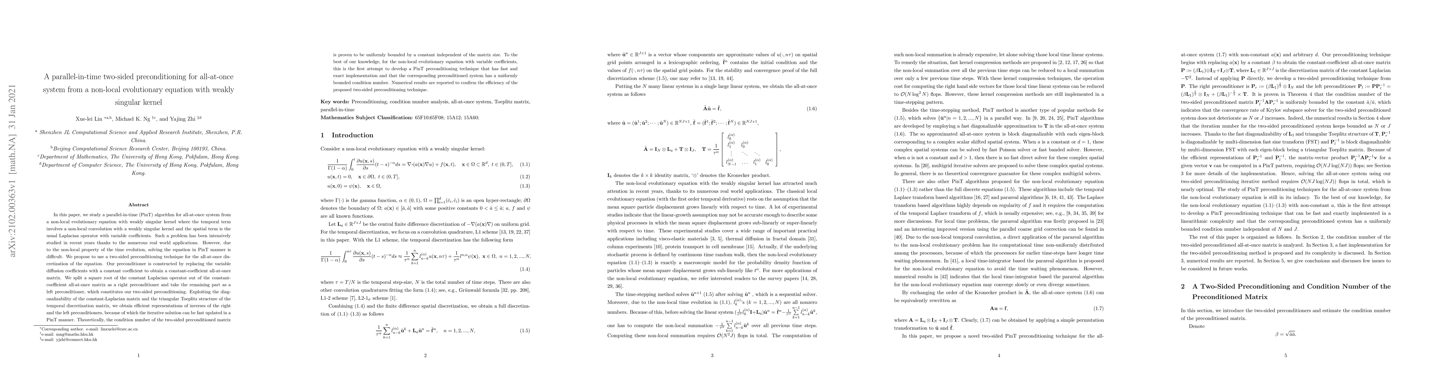This paper proposes a parallel-in-time (PinT) algorithm for solving an all-at-once system derived from a non-local evolutionary equation with a weakly singular kernel. The authors introduce a two-sided preconditioning technique to improve the efficiency of the iterative solver, achieving a uniformly bounded condition number and fast implementation. Numerical results validate the effectiveness of the proposed method.