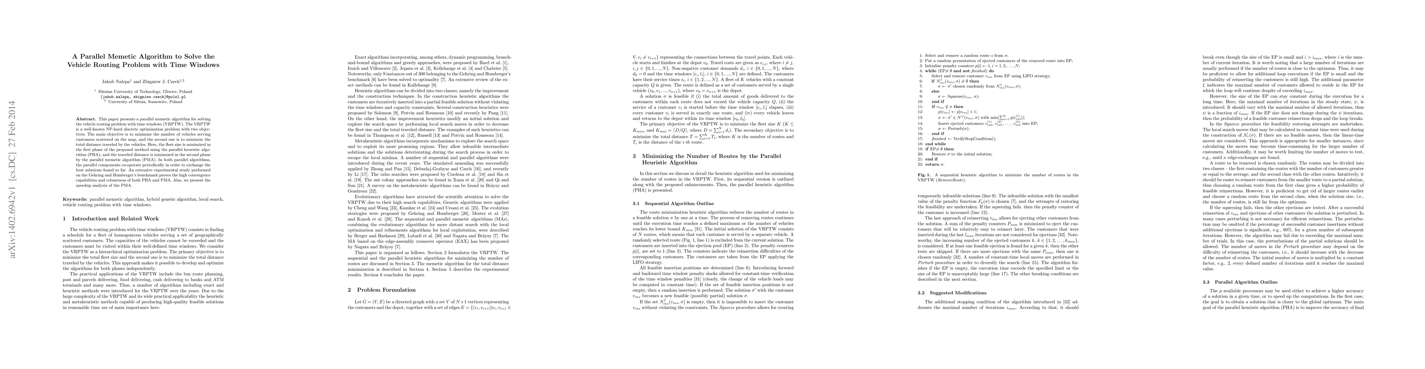 This paper introduces a parallel memetic algorithm for solving the NP-hard Vehicle Routing Problem with Time Windows (VRPTW), optimizing both fleet size and travel distance. The method employs a parallel heuristic algorithm followed by a parallel memetic algorithm, with both components exchanging solutions to enhance convergence.