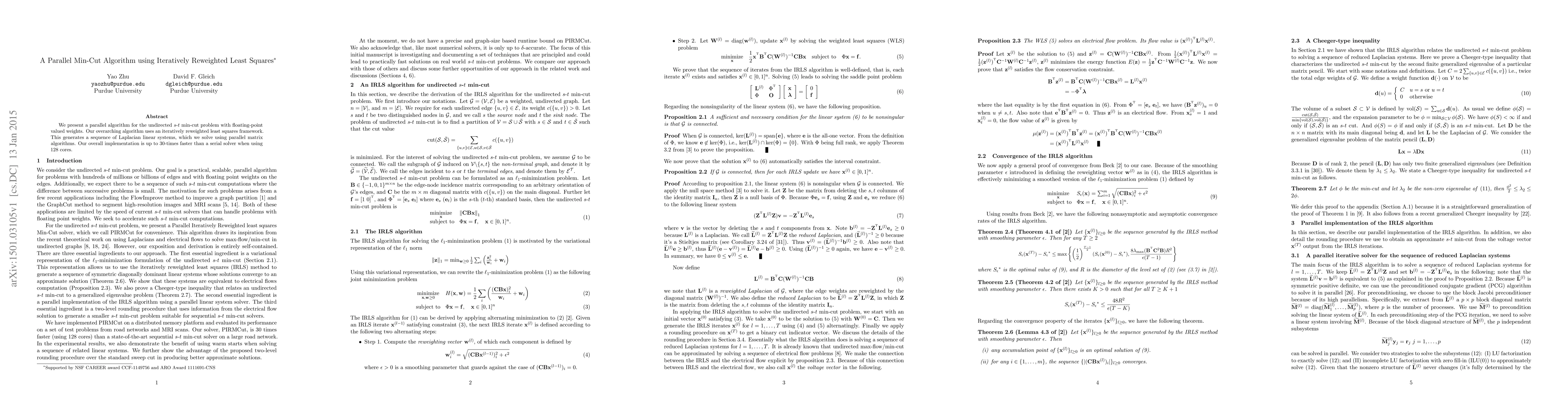 This paper introduces a parallel algorithm for solving the undirected $s,t$-mincut problem using iteratively reweighted least squares, achieving up to 30 times faster performance than serial solvers when utilizing 128 cores.