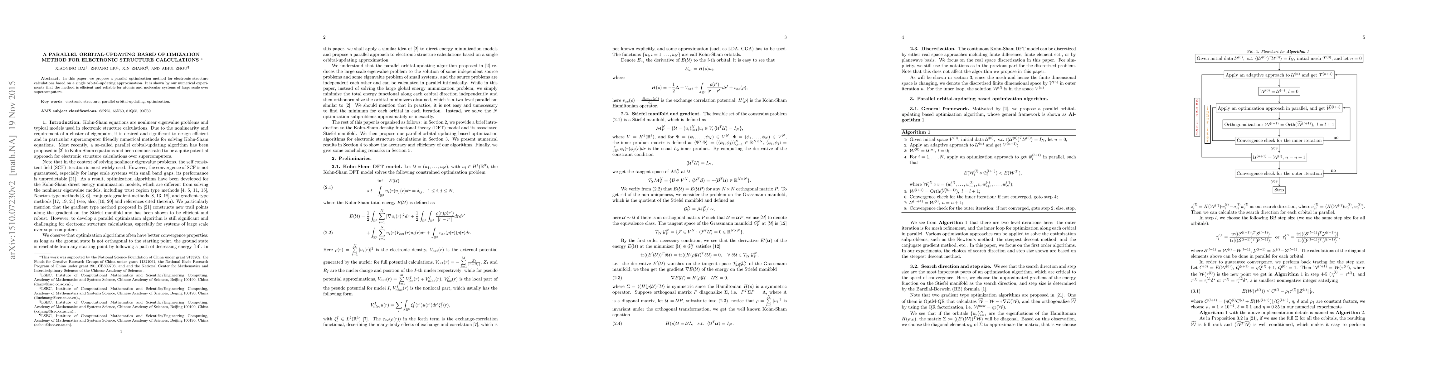 This paper introduces a parallel optimization method for electronic structure calculations using a single orbital-updating approximation, demonstrating its efficiency and reliability for large-scale atomic and molecular systems on supercomputers.