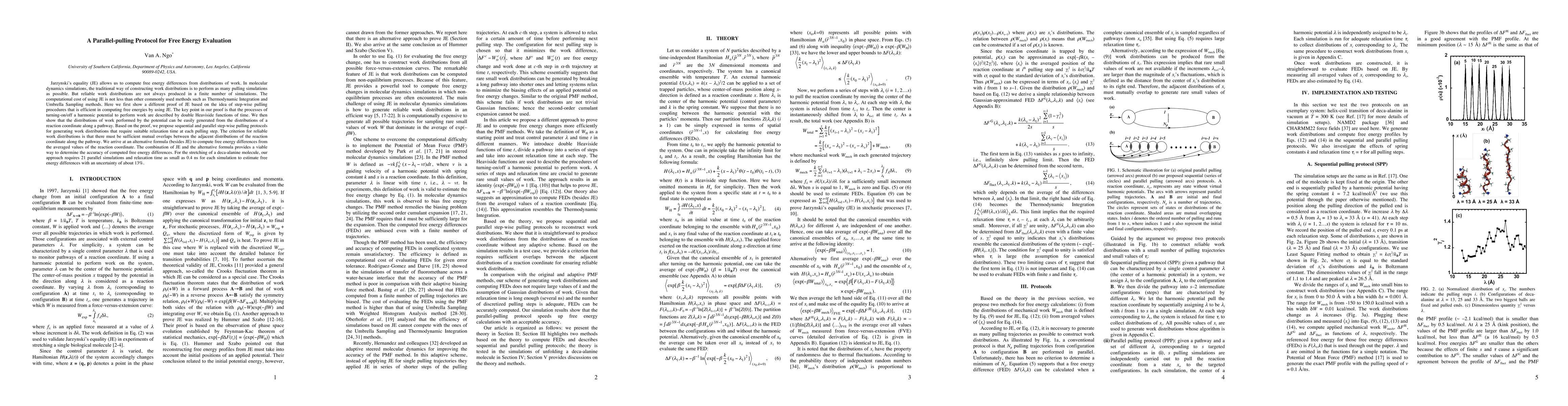 This paper proposes a parallel-pulling protocol for evaluating free energy differences using Jarzynski's equality, introducing step-wise pulling procedures with harmonic potentials. The method requires minimal simulations and relaxation time, achieving reliable work distributions through sufficient overlaps between adjacent reaction coordinate distributions.