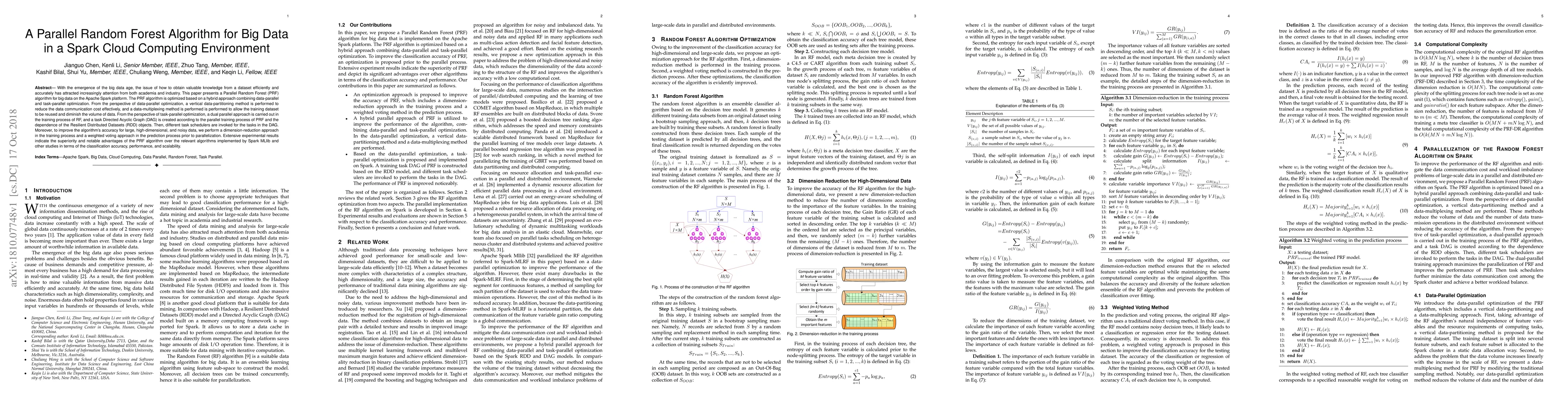 This paper introduces a Parallel Random Forest (PRF) algorithm optimized for big data processing on the Apache Spark platform, utilizing a hybrid data-parallel and task-parallel approach. The algorithm demonstrates superior classification accuracy, performance, and scalability compared to Spark MLlib and other methods.
