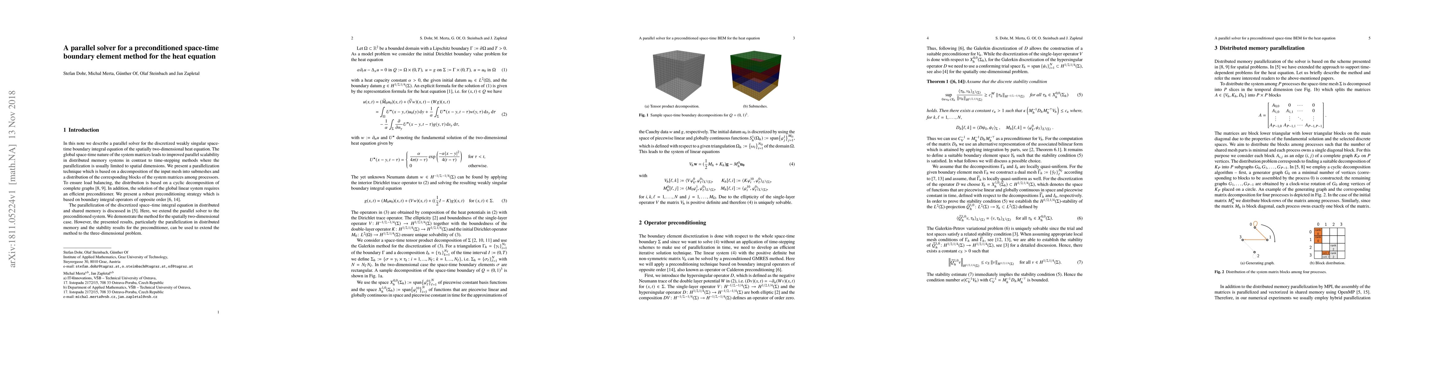 This paper presents a parallel solver for a preconditioned space-time boundary element method to solve the two-dimensional heat equation. It utilizes a decomposition technique to distribute system matrix blocks among processors for improved parallel scalability and employs a robust preconditioning strategy based on boundary integral operators.