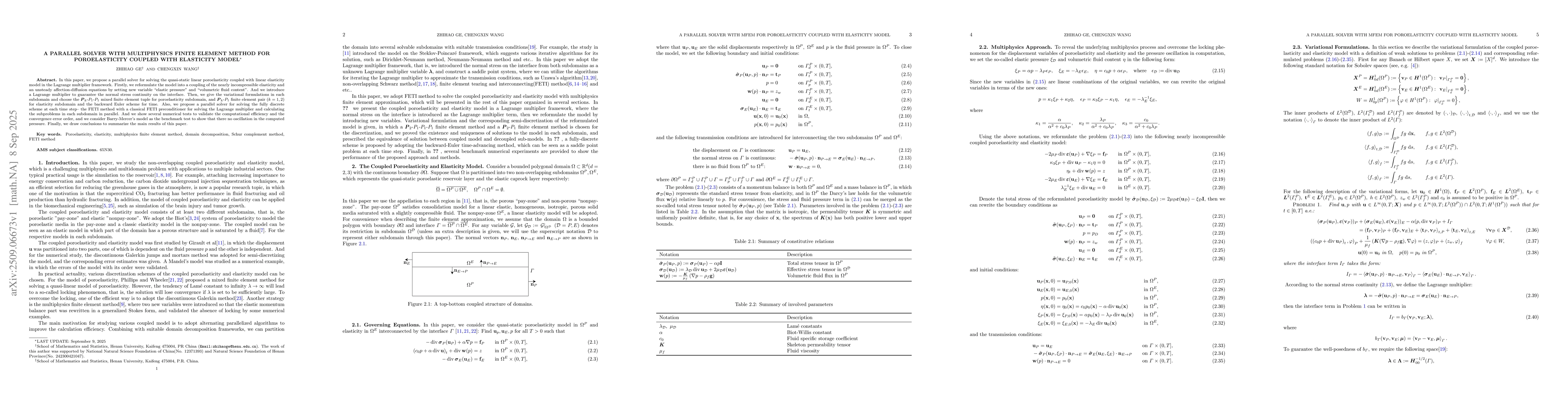 In this paper, we propose a parallel solver for solving the quasi-static linear poroelasticity coupled with linear elasticity model in the Lagrange multiplier framework. Firstly, we reformulate the model into a coupling of the nearly incompressible elasticity and an unsteady affection-diffusion equations by setting new variable ``elastic pressure" and ``volumetric fluid content". And we introduce a Lagrange multiplier to guarantee the normal stress continuity on the interface. Then, we give the variational formulations in each subdomain and choose the $\boldsymbol{P}_k$-$P_1$-$P_1$ mixed finite element tuple for poroelasticity subdomain, and $\boldsymbol{P}_k$-$P_1$ finite element pair ($k=1,2$) for elasticity subdomain and the backward Euler scheme for time. Also, we propose a parallel solver for solving the fully discrete scheme at each time step -- the FETI method with a classical FETI preconditioner for solving the Lagrange multiplier and calculating the subproblems in each subdomain in parallel. And we show several numerical tests to validate the computational efficiency and the convergence error order, and we consider Barry-Mercer's model as the benchmark test to show that there no oscillation in the computed pressure. Finally, we draw conclusions to summarize the main results of this paper.