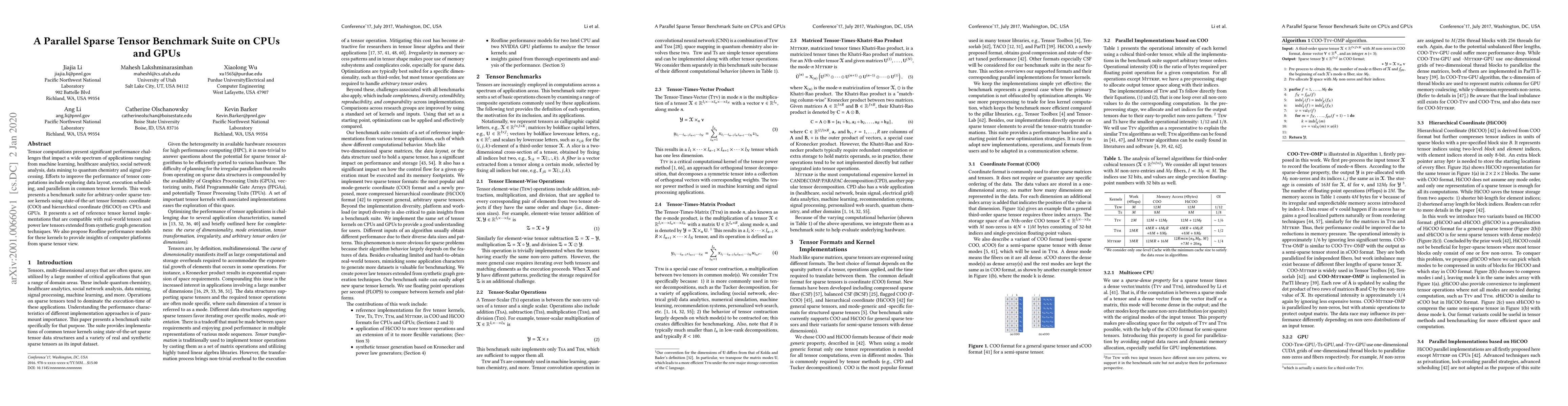 This paper introduces a benchmark suite for evaluating the performance of arbitrary-order sparse tensor kernels on CPUs and GPUs, employing advanced tensor formats like COO and HiCOO. It provides reference implementations and utilizes Roofline models to analyze computational efficiency across different platforms.