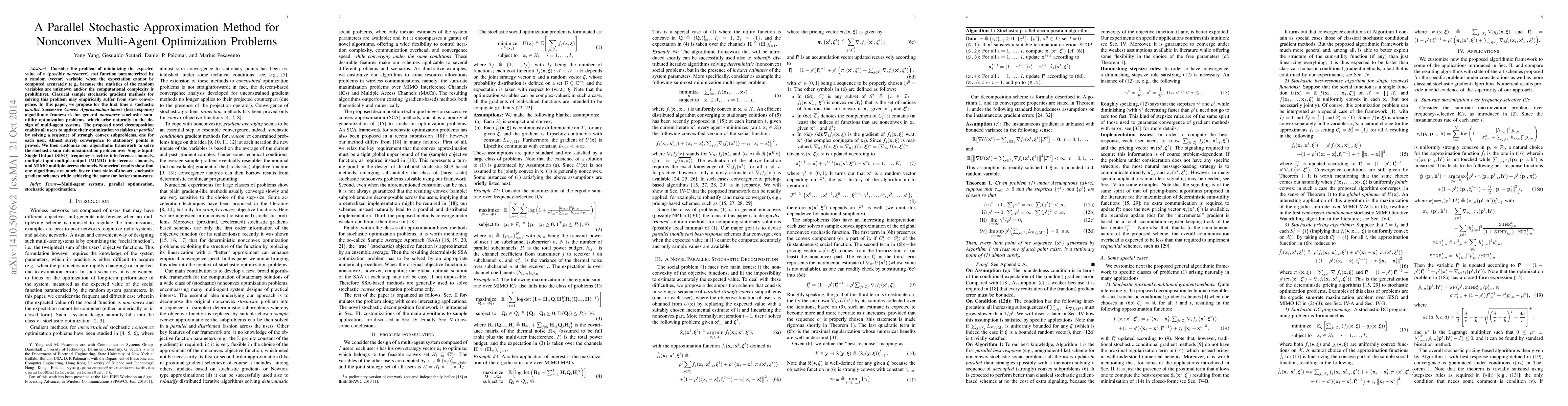 Consider the problem of minimizing the expected value of a (possibly nonconvex) cost function parameterized by a random (vector) variable, when the expectation cannot be computed accurately (e.g., because the statistics of the random variables are unknown and/or the computational complexity is prohibitive). Classical sample stochastic gradient methods for solving this problem may empirically suffer from slow convergence. In this paper, we propose for the first time a stochastic parallel Successive Convex Approximation-based (best-response) algorithmic framework for general nonconvex stochastic sum-utility optimization problems, which arise naturally in the design of multi-agent systems. The proposed novel decomposition enables all users to update their optimization variables in parallel by solving a sequence of strongly convex subproblems, one for each user. Almost surely convergence to stationary points is proved. We then customize our algorithmic framework to solve the stochastic sum rate maximization problem over Single-Input-Single-Output (SISO) frequency-selective interference channels, multiple-input-multiple-output (MIMO) interference channels, and MIMO multiple-access channels. Numerical results show that our algorithms are much faster than state-of-the-art stochastic gradient schemes while achieving the same (or better) sum-rates.