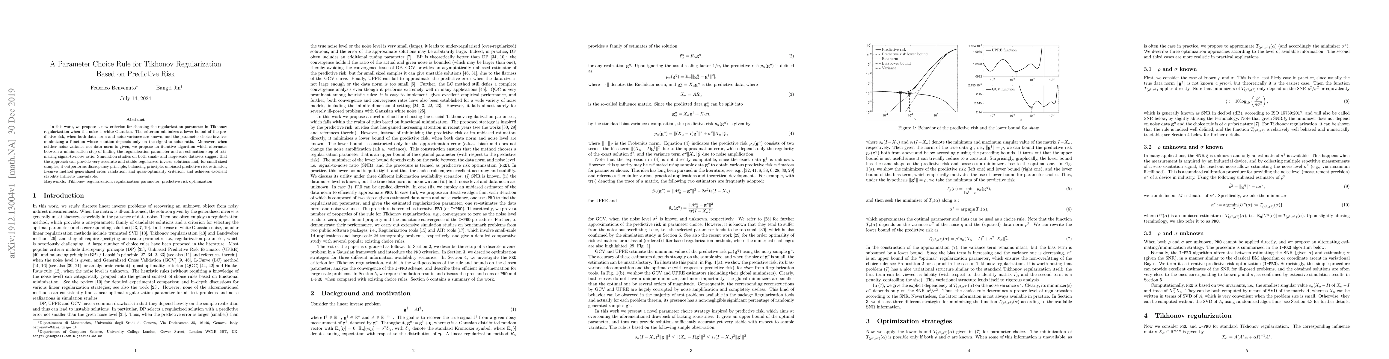 This paper proposes a new criterion for selecting the regularization parameter in Tikhonov regularization that minimizes predictive risk, especially effective when noise variance and data norm are known. For unknown parameters, it introduces an iterative algorithm that alternates between parameter estimation and minimization, demonstrating superior performance and stability in simulations compared to other methods.