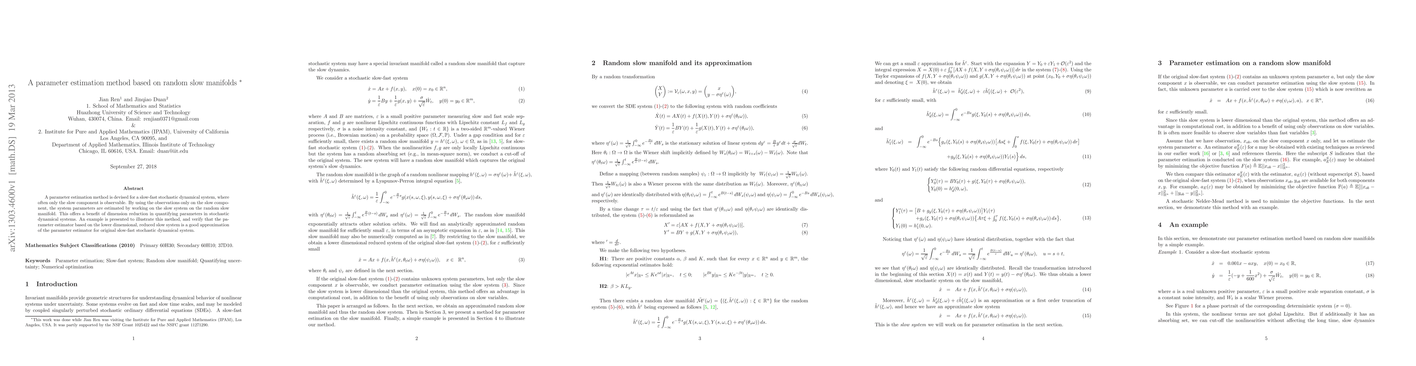 This paper proposes a parameter estimation method for slow-fast stochastic systems, utilizing observations from the slow component to estimate system parameters on the random slow manifold, achieving dimension reduction. An example verifies the effectiveness of this approach in approximating the full system's parameter estimator.