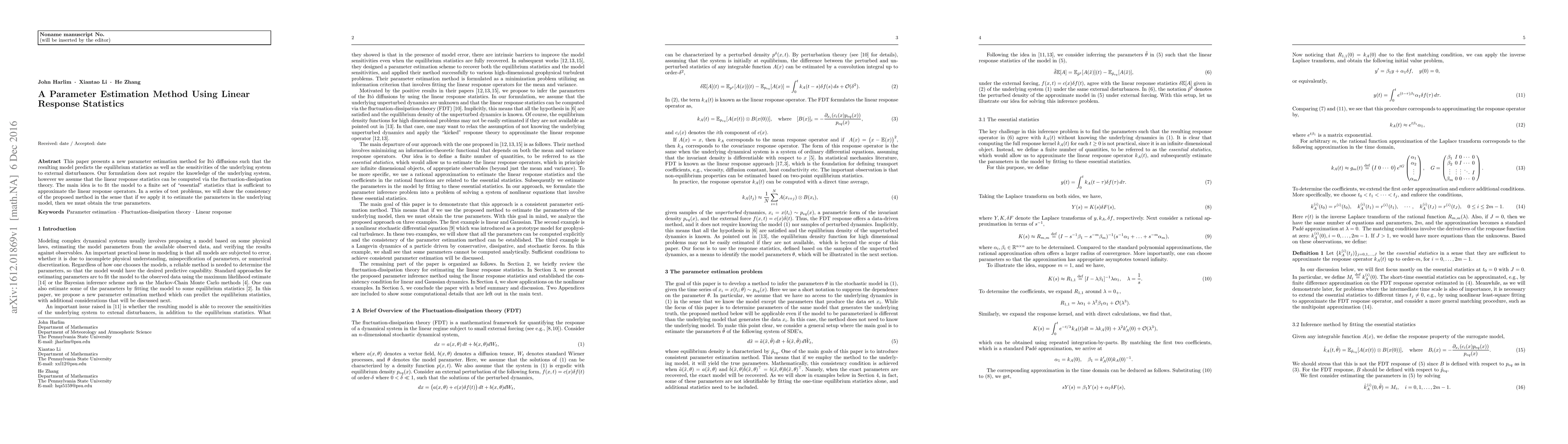 This paper introduces a novel parameter estimation method for Itô diffusions that predicts equilibrium statistics and system sensitivities to disturbances, relying on linear response statistics without needing detailed system knowledge. The method fits the model to a finite set of essential statistics, demonstrating consistency in test problems.