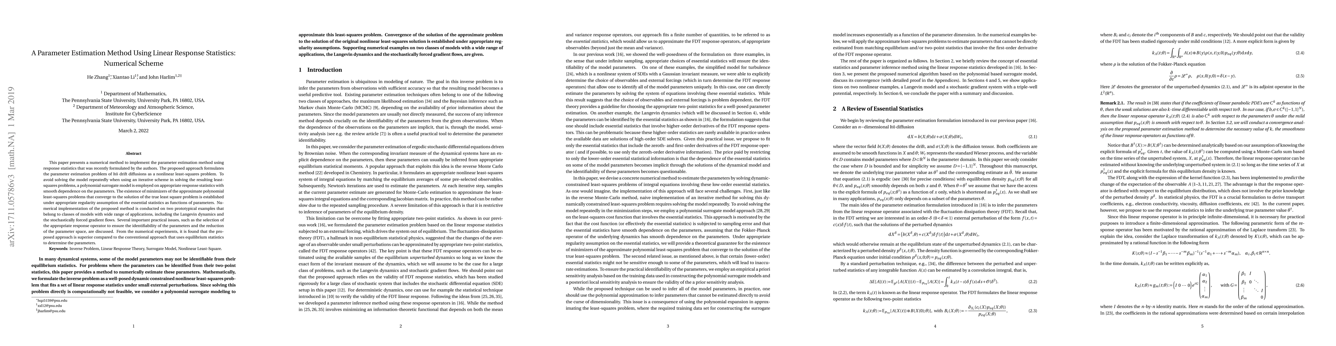 This paper introduces a numerical method for parameter estimation using linear response statistics, formulating the problem as a nonlinear least-squares issue and employing a polynomial surrogate model to avoid repetitive model solving. The method is shown to be effective through numerical experiments on models like Langevin dynamics and stochastically forced gradient flows, outperforming conventional equilibrium statistics-based approaches.