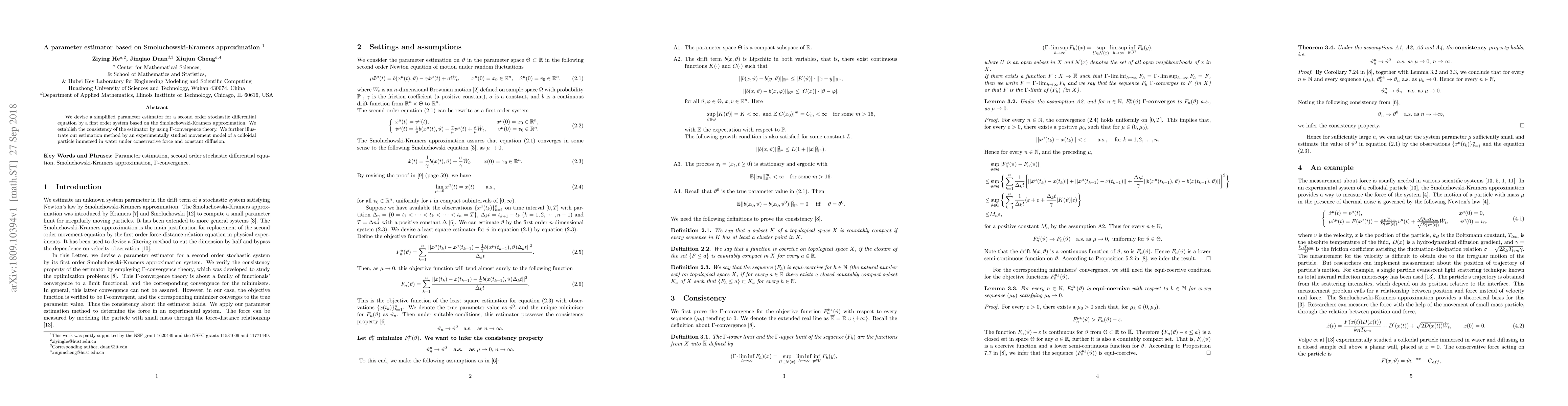 This paper introduces a simplified parameter estimator for second-order stochastic differential equations using a first-order system based on the Smoluchowski-Kramers approximation. The estimator's consistency is proven through Γ-convergence theory, and its effectiveness is demonstrated via a model of colloidal particle movement in water.