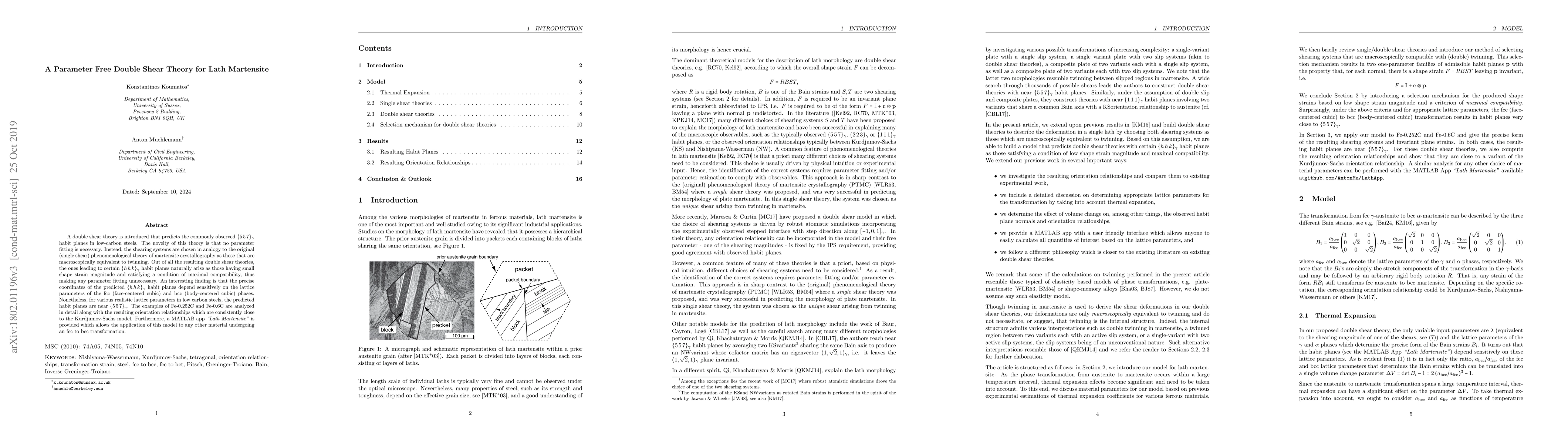 A double shear theory is introduced that predicts the commonly observed {5 5 7} habit planes in low-carbon steels. The novelty of this theory is that no parameter fitting is necessary. Instead, the shearing systems are chosen in analogy to the original (single shear) phenomenological theory of martensite crystallography as those that are macroscopically equivalent to twinning. Out of all the resulting double shear theories, the ones leading to certain {h h k} habit planes naturally arise as those having small shape strain magnitude and satisfying a condition of maximal compatibility, thus making any parameter fitting unnecessary. An interesting finding is that the precise coordinates of the predicted {h h k} habit planes depend sensitively on the lattice parameters of the fcc (face-centered cubic) and bcc (body-centered cubic) phases. Nonetheless, for various realistic lattice parameters in low carbon steels, the predicted habit planes are near {5 5 7}. The examples of Fe-0.252C and Fe-0.6C are analyzed in detail along with the resulting orientation relationships which are consistently close to the Kurdjumov-Sachs model. Furthermore, a MATLAB app (available at github.com/AntonMu/LathApp) is provided which allows the application of this model to any other material undergoing an fcc to bcc transformation.