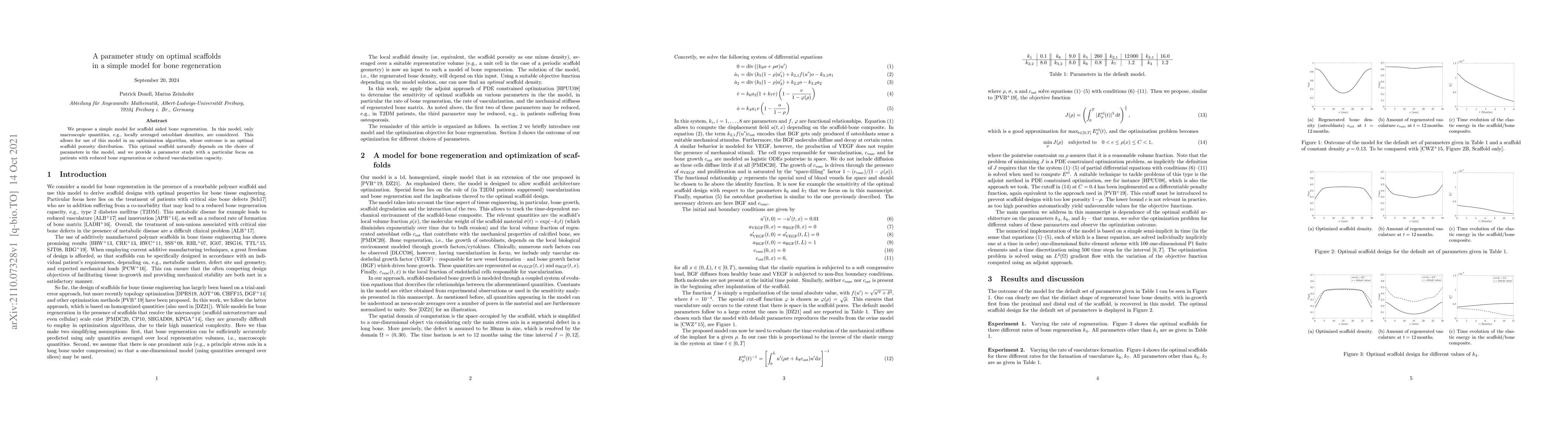 This paper presents a simple model for scaffold-aided bone regeneration focusing on macroscopic quantities, and uses an optimization algorithm to determine the optimal scaffold porosity distribution. The study emphasizes parameter sensitivity, particularly for patients with impaired bone regeneration or vascularization.