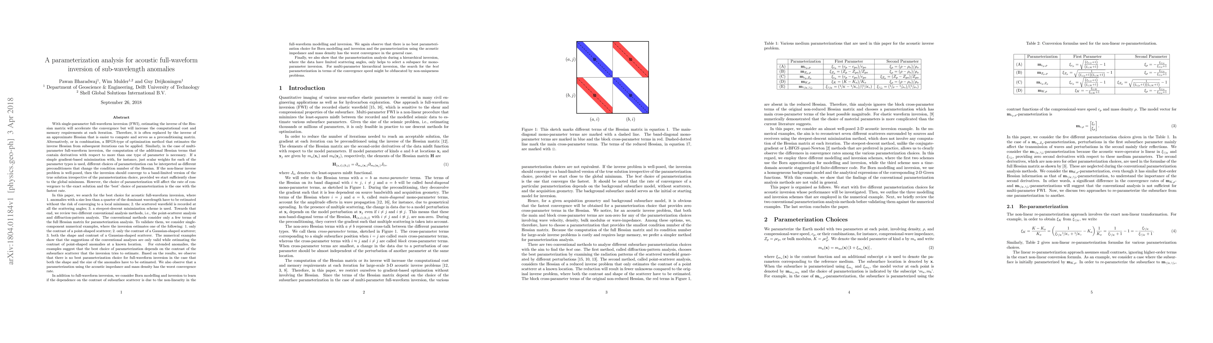 In the case of multi-parameter full-waveform inversion, the computation of the additional Hessian terms that contain derivatives with respect to more than one type of parameter is necessary. If a simple gradient-based minimization is used, different choices of parameterization can be interpreted as different preconditioners that change the condition number of the Hessian. If the non-linear inverse problem is well-posed, then the inversion should converge to a band-limited version of the true solution irrespective of the parameterization choice, provided we start sufficiently close to the global minimum. However, the choice of parameterization will affect the rate of convergence to the exact solution and the best choice of parameterization is the one with the fastest rate. In this paper, we search for the best choice for acoustic multi-parameter full-waveform inversion, where 1. anomalies with a size less than a quarter of the dominant wavelength have to be estimated without the risk of converging to a local minimum; 2. the scattered wavefield is recorded at all the scattering angles; 3. a steepest-descent minimization scheme is used. Our examples suggest that the best choice of parameterization depends on the contrast of the subsurface scatterer that the inversion tries to estimate. Based on the results, we observe that there is no best parameterization choice for full-waveform inversion. We also observe that a parameterization using the acoustic impedance and mass density has the worst convergence rate. Finally, we also show that the parameterization analysis during a hierarchical inversion, where the data have limited scattering angles, only helps to select a subspace for mono-parameter inversion. For multi-parameter hierarchical inversion, the search for the best parameterization in terms of the convergence speed might be obfuscated by non-uniqueness problems.