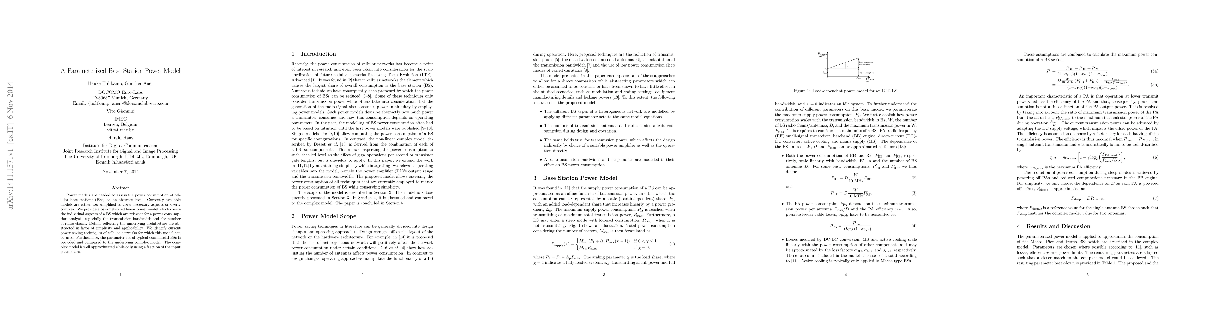 This paper introduces a simplified yet effective parameterized linear power model for cellular Base Stations, balancing complexity and applicability. It focuses on transmission bandwidth and radio chains, providing a useful tool for power consumption analysis and identifying power-saving techniques.
