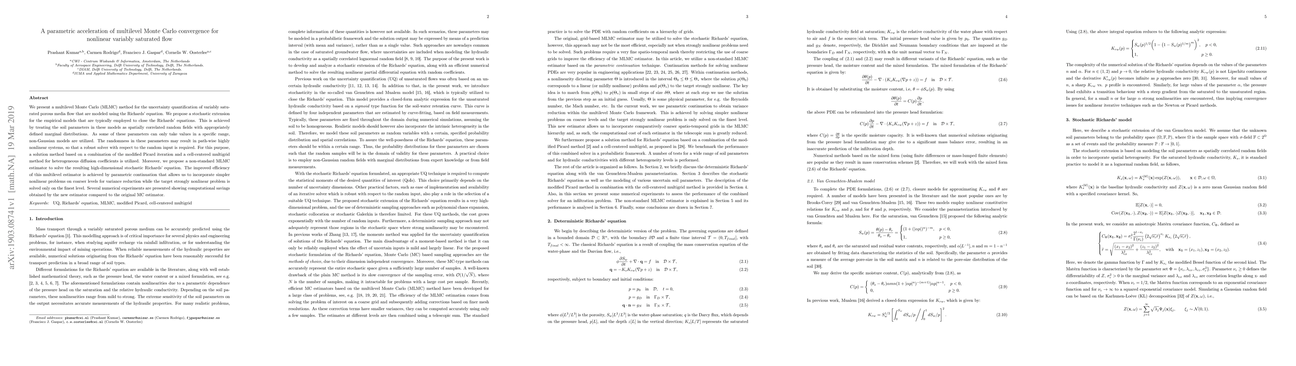 This paper introduces a parametric acceleration technique for multilevel Monte Carlo (MLMC) methods to enhance the convergence of uncertainty quantification in variably saturated porous media flow modeled by Richards' equation. The proposed method employs a stochastic extension of empirical models, utilizing non-Gaussian distributions for spatially correlated random soil parameters, and achieves computational savings through a novel MLMC estimator with parametric continuation.