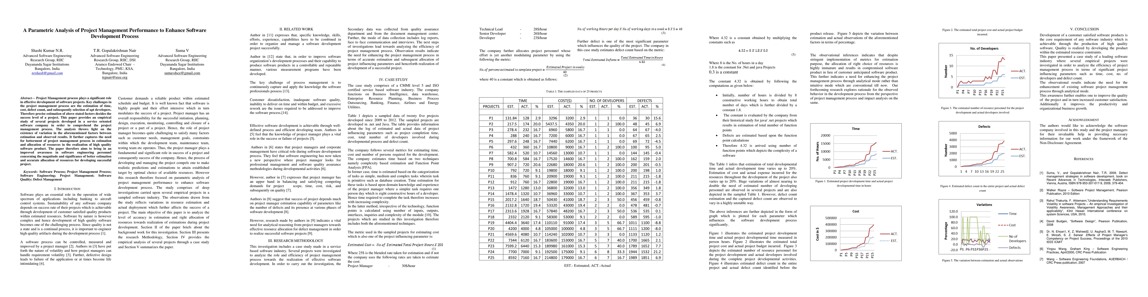 This paper conducts a parametric analysis of project management performance in software development, highlighting discrepancies between estimations and actual outcomes in time, cost, and defect counts. It emphasizes the need for improved estimation and resource allocation to enhance project success.