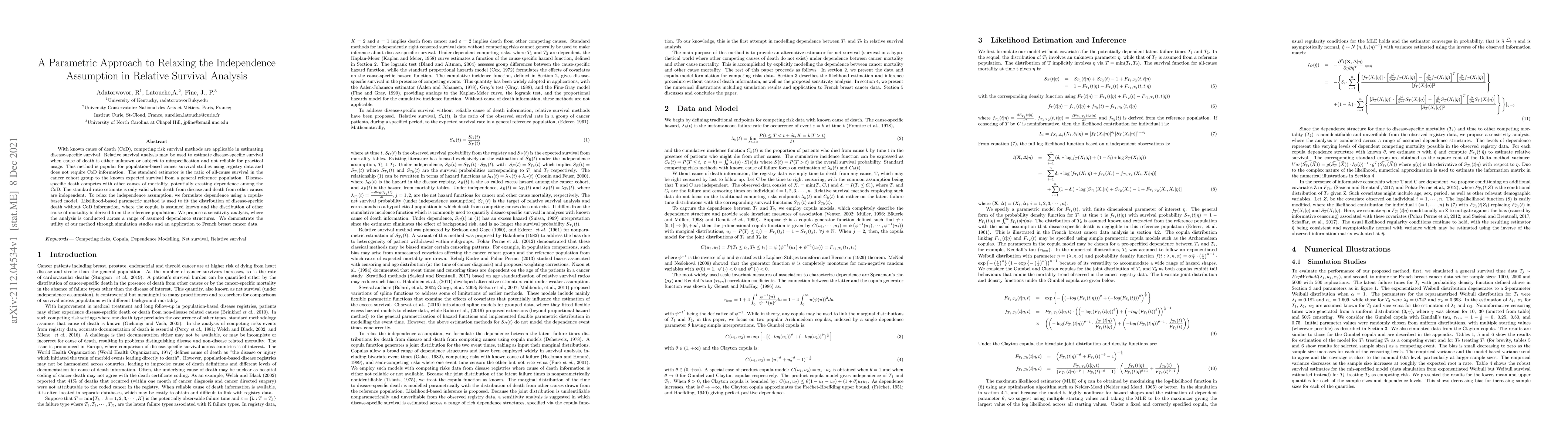 This paper proposes a parametric approach to relax the independence assumption in relative survival analysis using a copula-based model. The method estimates the distribution of disease-specific death without requiring cause of death information, and demonstrates its utility through simulation and an application to French breast cancer data.