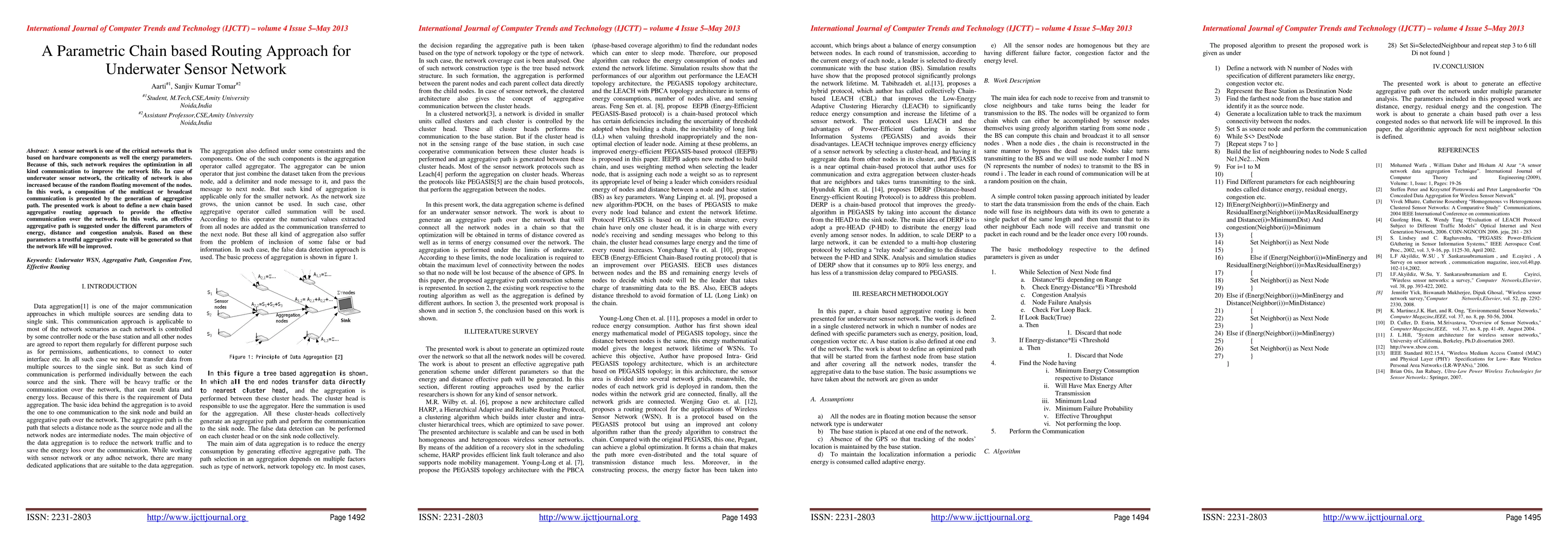 A new chain-based routing approach is proposed for underwater sensor networks to improve communication efficiency and extend network life. The approach generates an aggregative path based on energy, distance, and congestion analysis to create a trustworthy route.