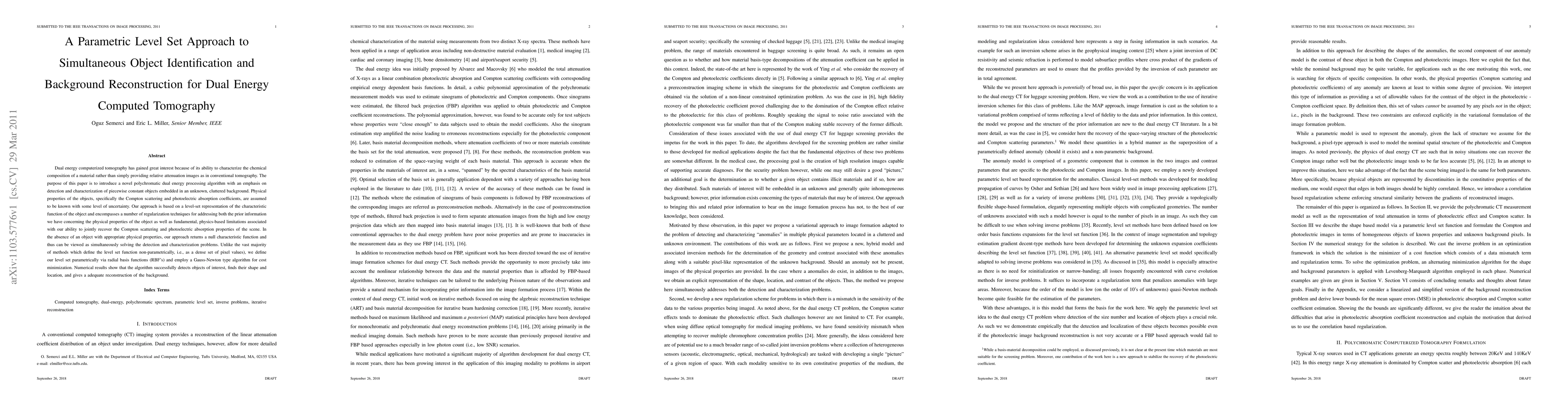 This paper introduces a parametric level set approach for simultaneous object identification and background reconstruction in dual energy computed tomography. The method uses radial basis functions for a parametric level set representation and a Gauss-Newton algorithm to minimize the cost function, achieving accurate detection and characterization of objects amidst an unknown background.