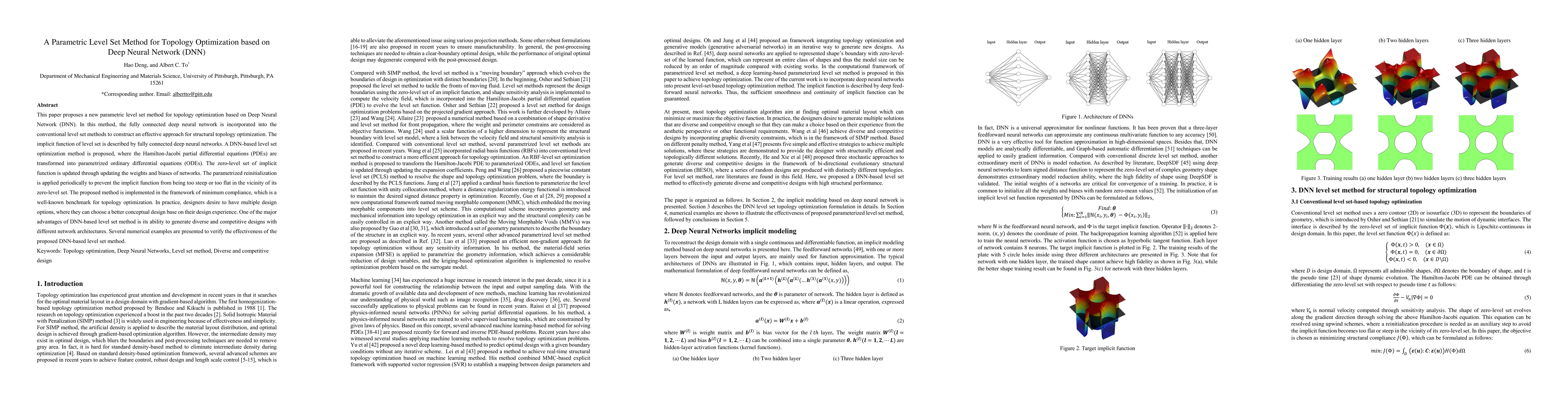This paper introduces a parametric level set method for topology optimization that leverages Deep Neural Networks (DNN) to enhance structural design. The method transforms Hamilton-Jacobi PDEs into parametrized ODEs, updating the zero-level set through network reinitialization, and demonstrates its effectiveness through minimum compliance benchmarks and diverse design generation.