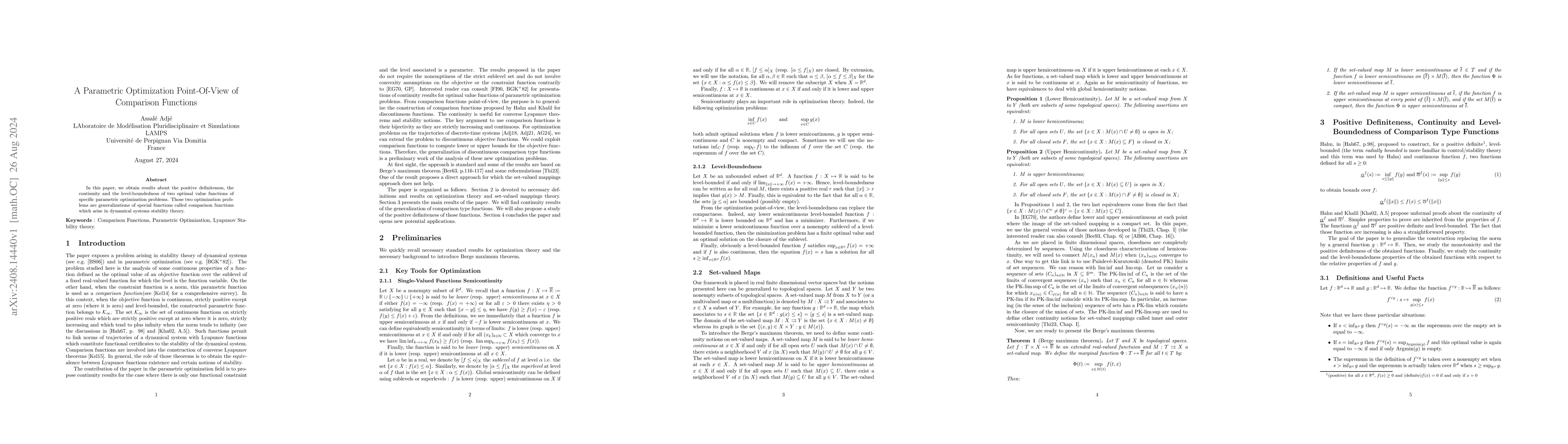 In this paper, we obtain results about the positive definiteness, the continuity and the level-boundedness of two optimal value functions of specific parametric optimization problems. Those two optimization problems are generalizations of special functions called comparison functions which arise in dynamical systems stability theory.