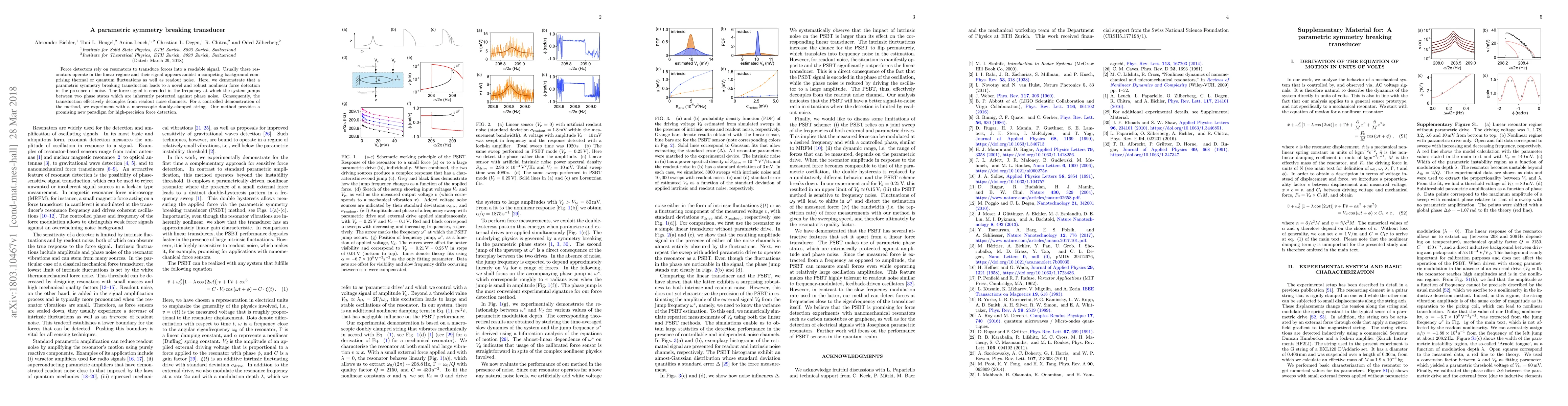 This paper introduces a novel parametric symmetry breaking transducer that enhances force detection by utilizing nonlinear dynamics, enabling robust signal transduction in noisy environments. The method encodes force signals in the frequency of phase state transitions, decoupling them from noise, demonstrated through experiments on a macroscopic doubly-clamped string.