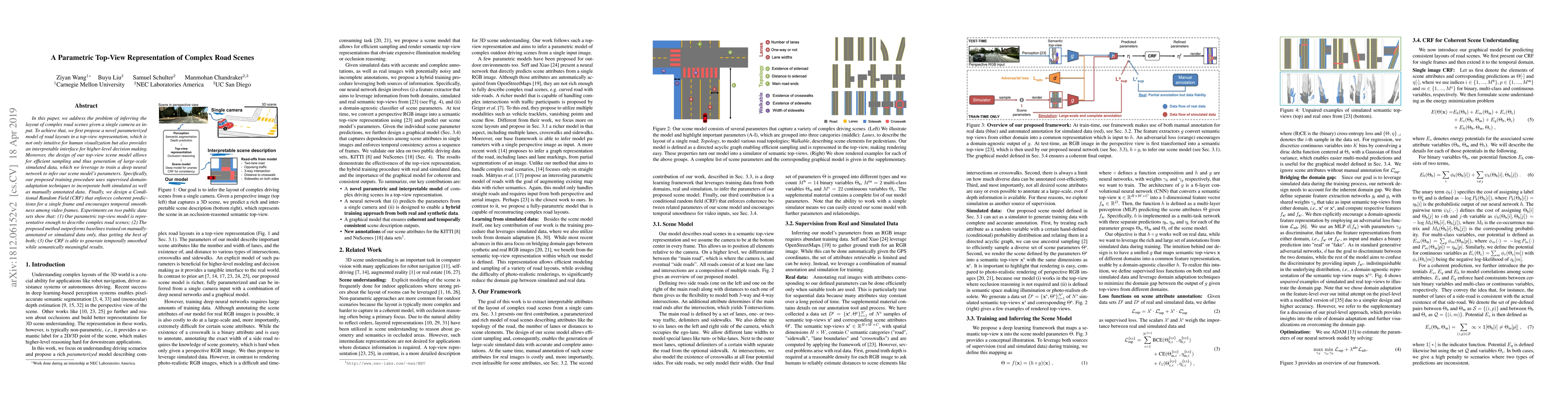 In this paper, we address the problem of inferring the layout of complex road scenes given a single camera as input. To achieve that, we first propose a novel parameterized model of road layouts in a top-view representation, which is not only intuitive for human visualization but also provides an interpretable interface for higher-level decision making. Moreover, the design of our top-view scene model allows for efficient sampling and thus generation of large-scale simulated data, which we leverage to train a deep neural network to infer our scene model's parameters. Specifically, our proposed training procedure uses supervised domain-adaptation techniques to incorporate both simulated as well as manually annotated data. Finally, we design a Conditional Random Field (CRF) that enforces coherent predictions for a single frame and encourages temporal smoothness among video frames. Experiments on two public data sets show that: (1) Our parametric top-view model is representative enough to describe complex road scenes; (2) The proposed method outperforms baselines trained on manually-annotated or simulated data only, thus getting the best of both; (3) Our CRF is able to generate temporally smoothed while semantically meaningful results.
