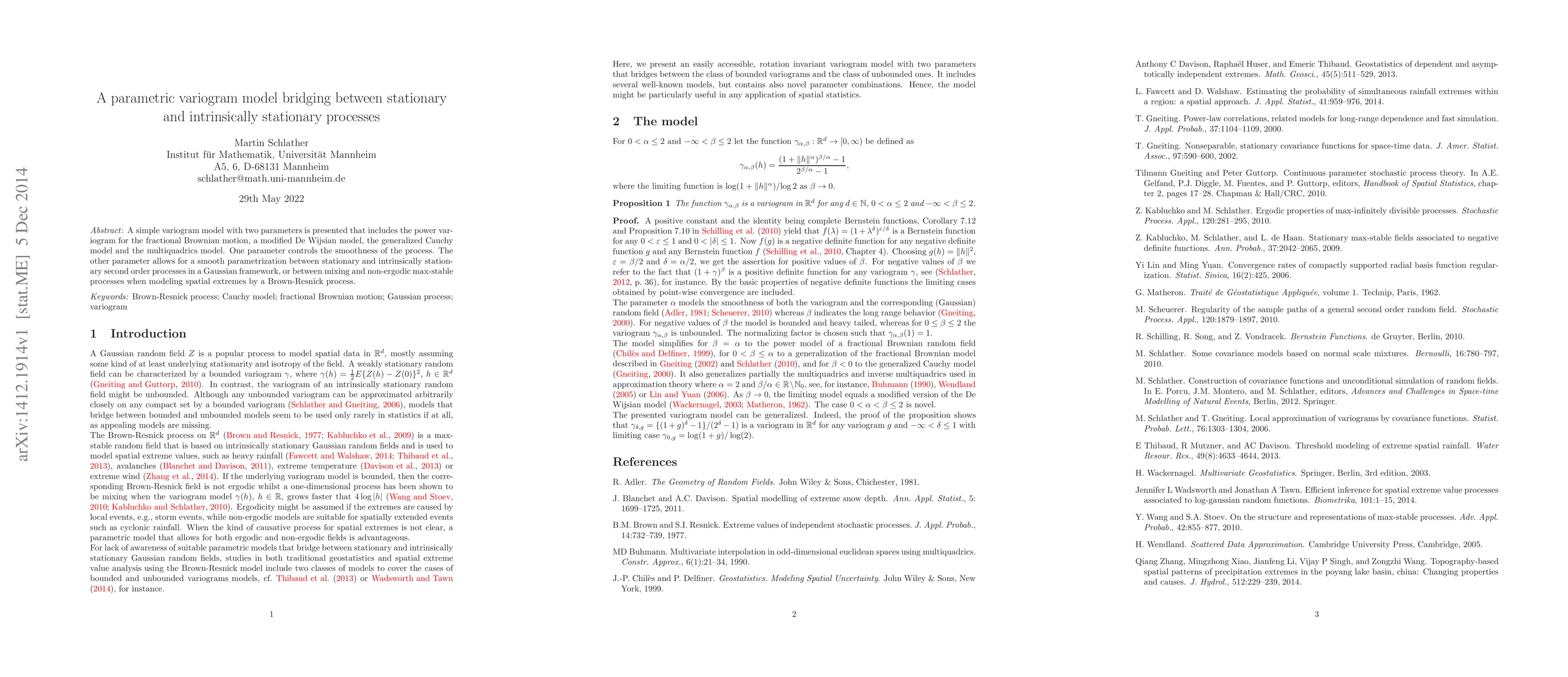 A simple variogram model with two parameters is presented that includes the power variogram for the fractional Brownian motion, a modified De Wijsian model, the generalized Cauchy model and the multiquadrics model. One parameter controls the smoothness of the process. The other parameter allows for a smooth parametrization between stationary and intrinsically stationary second order processes in a Gaussian framework, or between mixing and non-ergodic max-stable processes when modeling spatial extremes by a Brown-Resnick process.