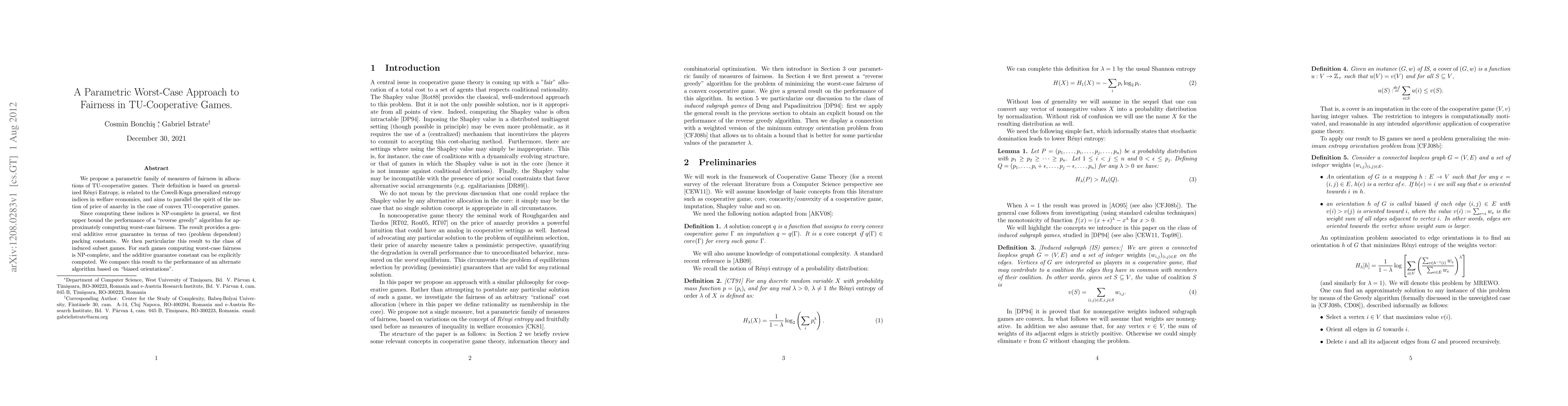 This paper introduces a parametric family of fairness measures for TU-cooperative games based on generalized Renyi Entropy, proposing a "reverse greedy" algorithm for approximate worst-case fairness computation with an additive error guarantee. It also applies this approach to induced subset games, comparing its performance to an alternative "biased orientations" algorithm.