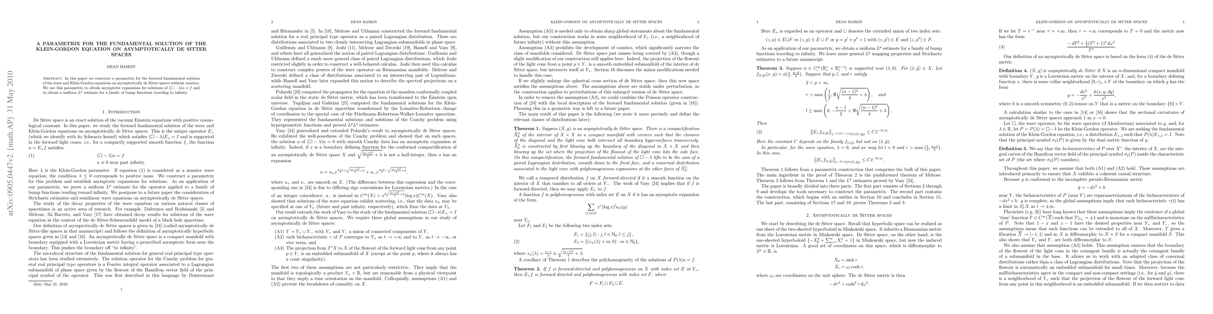 In this paper we construct a parametrix for the forward fundamental solution of the wave and Klein-Gordon equations on asymptotically de Sitter spaces without caustics. We use this parametrix to obtain asymptotic expansions for solutions of the inhomogeneous equation and to obtain a uniform L^p estimate for a family of bump functions traveling to infinity.