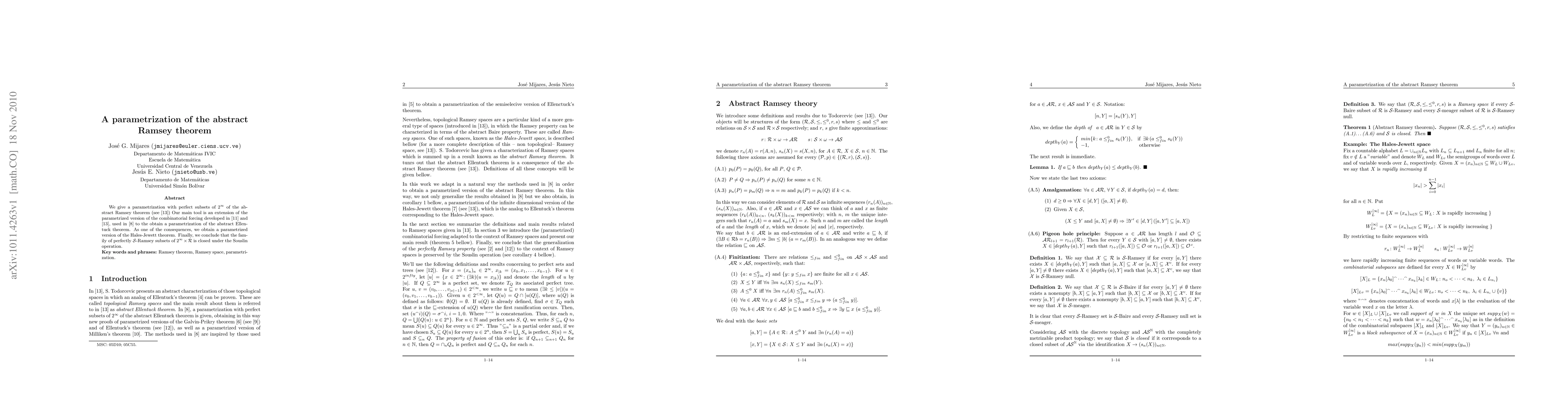 This paper parametrizes the abstract Ramsey theorem using perfect subsets of $2^{\infty}$ by extending parametrized combinatorial forcing techniques. As a result, it also provides a parametrized version of the Hales-Jewett theorem and proves the closure of perfectly ${\cal S}$-Ramsey subsets under the Souslin operation.