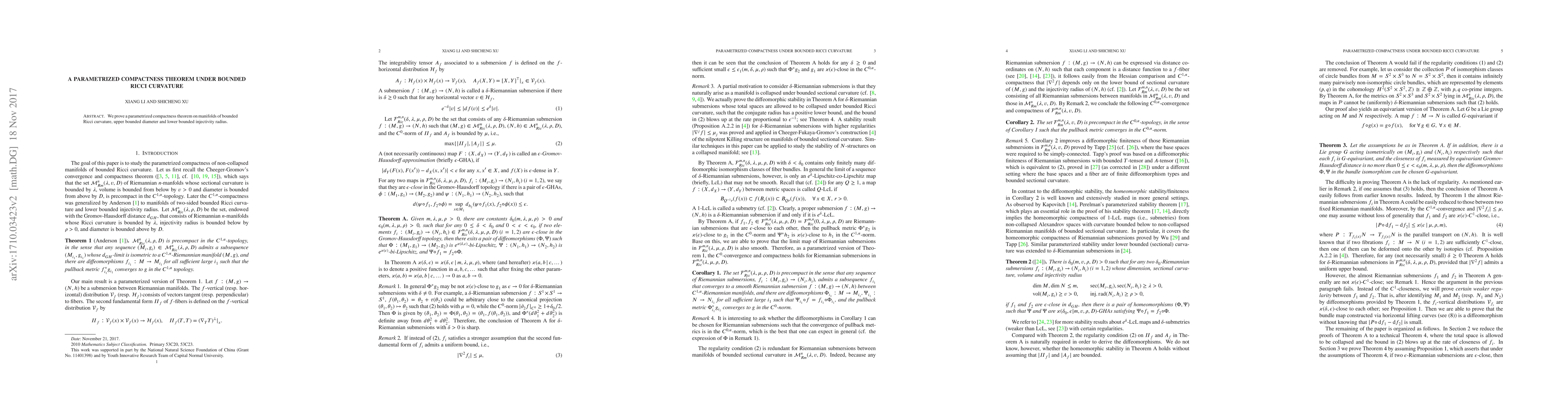 Summary: This paper establishes a parametrized compactness theorem for manifolds with bounded Ricci curvature, limited diameter, and a minimum injectivity radius, providing a framework for understanding the structure of such geometric spaces.