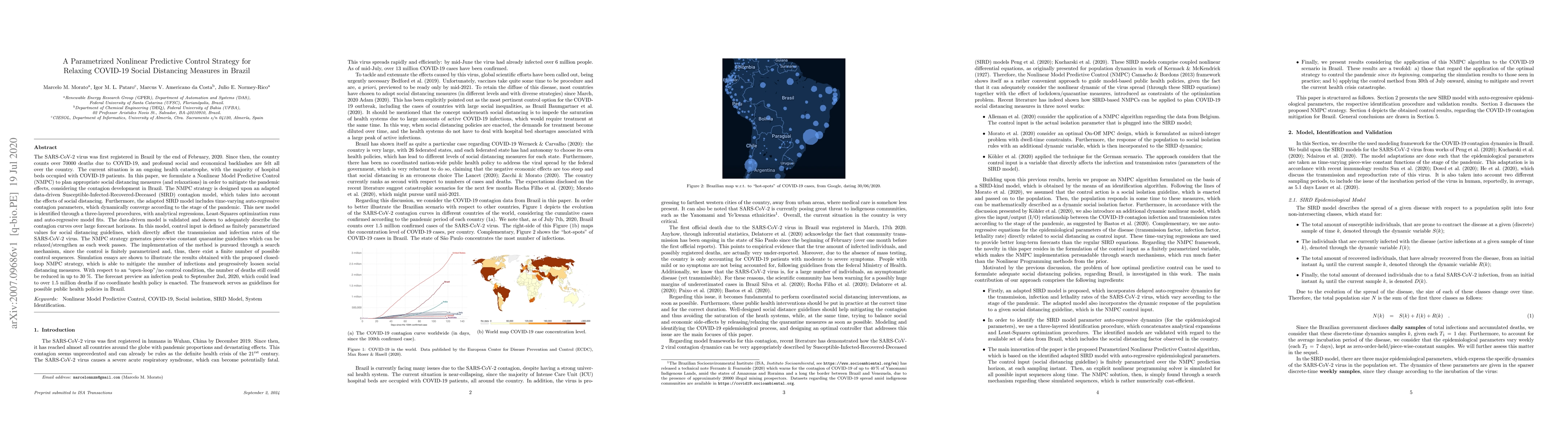 In this paper, we formulate a Nonlinear Model Predictive Control (NMPC) to plan appropriate social distancing measures (and relaxations) in order to mitigate the COVID-19 pandemic effects, considering the contagion development in Brazil. The NMPC strategy is designed upon an adapted data-driven Susceptible-Infected-Recovered-Deceased (SIRD) contagion model, which takes into account the effects of social distancing. Furthermore, the adapted SIRD model includes time-varying auto-regressive contagion parameters, which dynamically converge according to the stage of the pandemic. This new model is identified through a three-layered procedures, with analytical regressions, Least-Squares optimization runs and auto-regressive model fits. The data-driven model is validated and shown to adequately describe the contagion curves over large forecast horizons. In this model, control input is defined as finitely parametrized values for social distancing guidelines, which directly affect the transmission and infection rates of the SARS-CoV-2 virus. The NMPC strategy generates piece-wise constant quarantine guidelines which can be relaxed/strengthen as each week passes. The implementation of the method is pursued through a search mechanism, since the control is finitely parametrized and, thus, there exist a finite number of possible control sequences. Simulation essays are shown to illustrate the results obtained with the proposed closed-loop NMPC strategy, which is able to mitigate the number of infections and progressively loosen social distancing measures. With respect to an "open-loop"/no control condition, the number of deaths still could be reduced in up to 30 %. The forecast preview an infection peak to September 2nd, 2020, which could lead to over 1.5 million deaths if no coordinate health policy is enacted. The framework serves as guidelines for possible public health policies in Brazil.