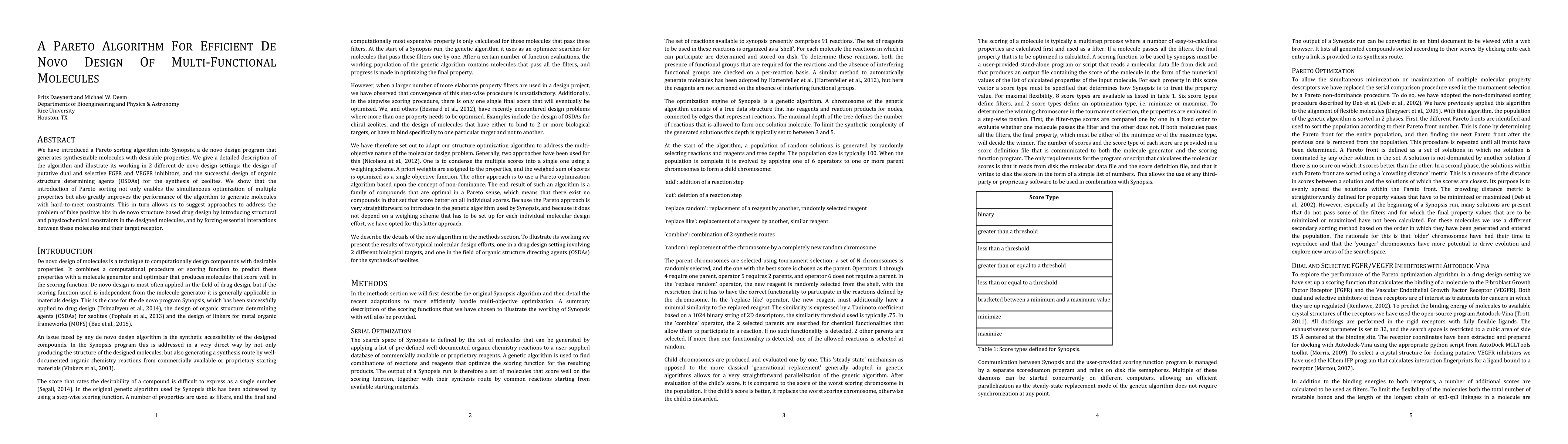 This paper introduces a Pareto sorting algorithm into the Synopsis de novo design program to optimize the generation of multi-functional molecules. The algorithm enhances the design of molecules with desirable properties, particularly in dual FGFR and VEGFR inhibitors and organic structure determining agents for zeolites, demonstrating improved performance and reduced false positives.
