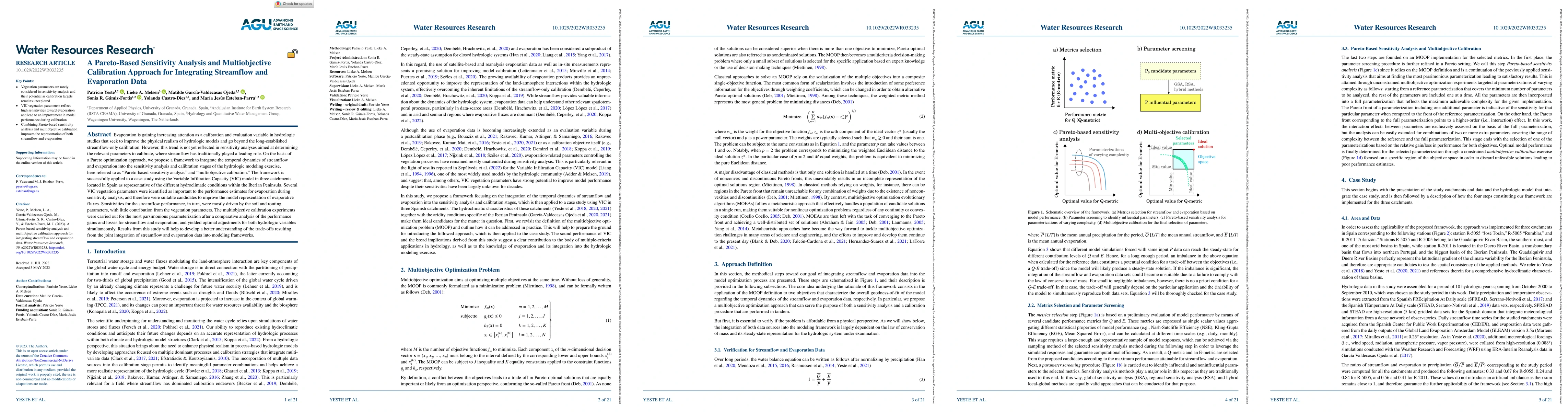 This research introduces a Pareto-based sensitivity analysis and multiobjective calibration method to integrate streamflow and evaporation data in hydrologic models. Applied to the VIC model in Spanish catchments, it identifies vegetation parameters crucial for evaporation performance and soil/routing parameters for streamflow, enabling simultaneous optimization for both variables.