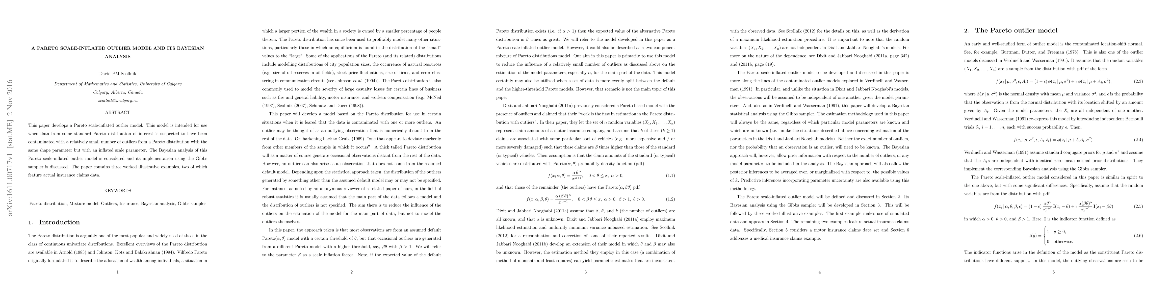 This paper introduces a Pareto scale-inflated outlier model for data suspected of having outliers from a Pareto distribution with an inflated scale parameter. It discusses Bayesian analysis and implementation using the Gibbs sampler, with illustrative examples using actual insurance claims data.