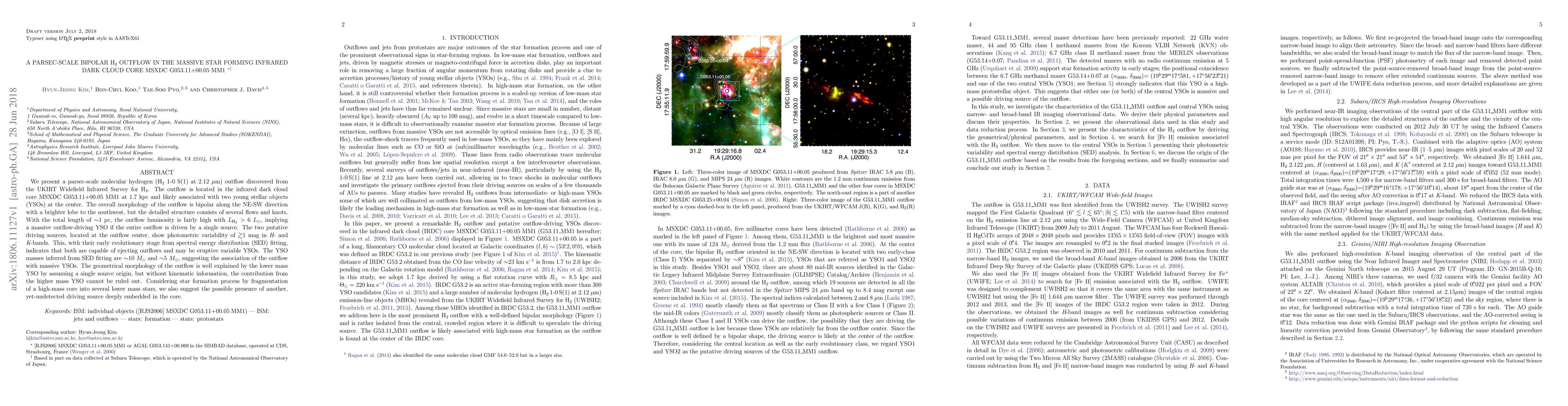 We present a parsec-scale molecular hydrogen (H$_2$ 1-0 S(1) at 2.12~\micron) outflow discovered from the UKIRT Widefield Infrared Survey for H$_2$. The outflow is located in the infrared dark cloud core MSXDC G053.11+00.05 MM1 at 1.7 kpc and likely associated with two young stellar objects (YSOs) at the center. The overall morphology of the outflow is bipolar along the NE-SW direction with a brighter lobe to the southwest, but the detailed structure consists of several flows and knots. With the total length of $\sim$1 pc, the outflow luminosity is fairly high with $L_{\rm H_{2}} > 6~L_{\sun}$, implying a massive outflow-driving YSO if the entire outflow is driven by a single source. The two putative driving sources, located at the outflow center, show photometric variability of $\gtrsim$1 mag in {\it H}- and {\it K}-bands. This, with their early evolutionary stage from spectral energy distribution (SED) fitting, indicates that both are capable of ejecting outflows and may be eruptive variable YSOs. The YSO masses inferred from SED fitting are $\sim$10~$M_{\sun}$ and $\sim$5~$M_{\sun}$, suggesting the association of the outflow with massive YSOs. The geometrical morphology of the outflow is well explained by the lower mass YSO by assuming a single source origin, but without kinematic information, the contribution from the higher mass YSO cannot be ruled out. Considering star formation process by fragmentation of a high-mass core into several lower mass stars, we also suggest the possible presence of another, yet-undetected driving source deeply embedded in the core.