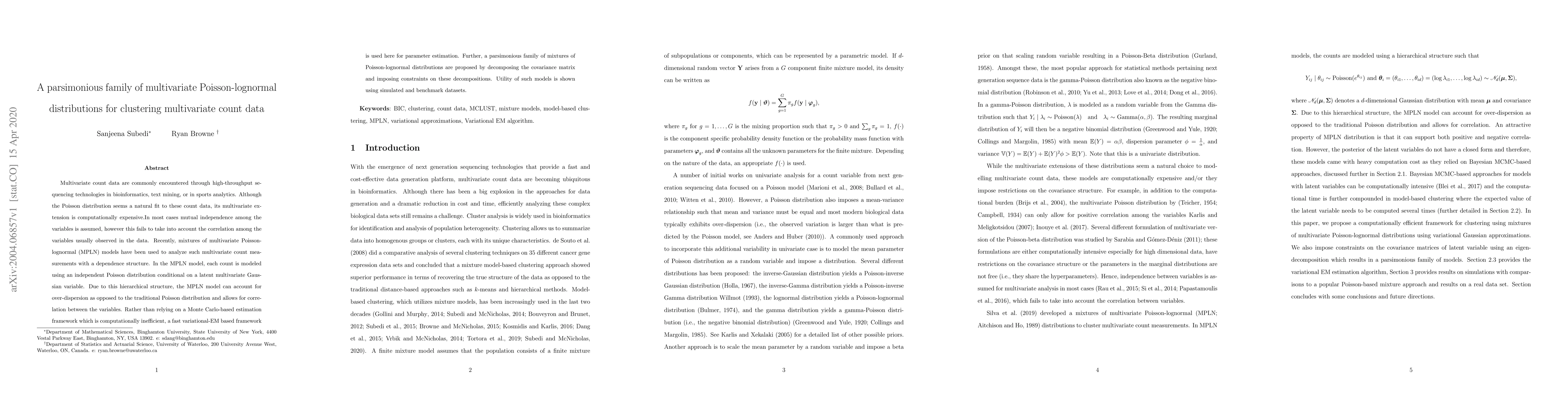 This paper proposes a parsimonious family of multivariate Poisson-lognormal distributions for clustering multivariate count data, addressing the computational inefficiencies and lack of correlation modeling in traditional Poisson models. The new approach uses a fast variational-EM based framework for parameter estimation and demonstrates utility through simulated and benchmark datasets.