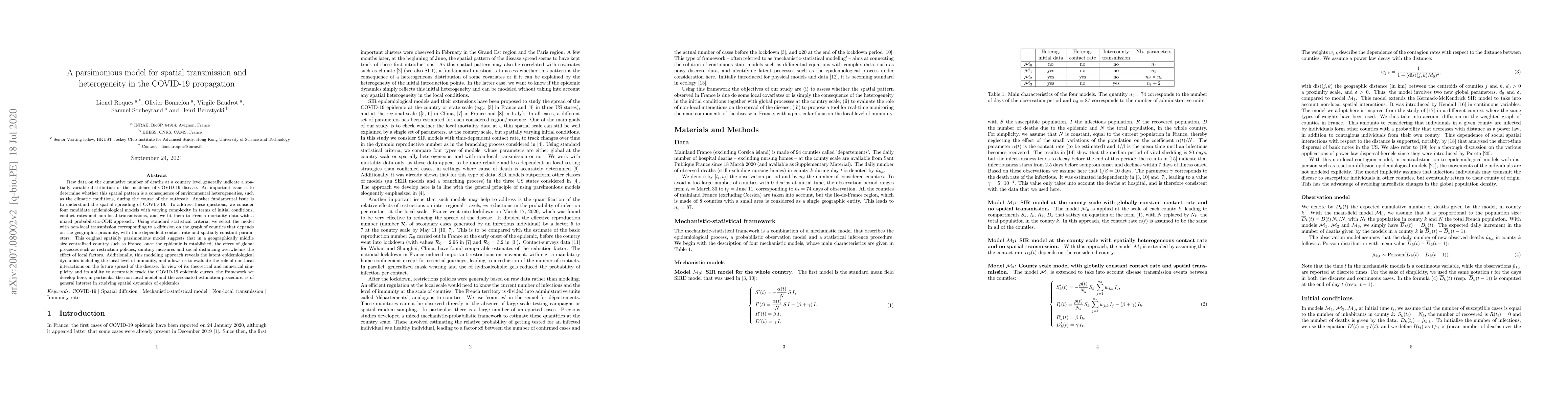 Raw data on the cumulative number of deaths at a country level generally indicate a spatially variable distribution of the incidence of COVID-19 disease. An important issue is to determine whether this spatial pattern is a consequence of environmental heterogeneities, such as the climatic conditions, during the course of the outbreak. Another fundamental issue is to understand the spatial spreading of COVID-19. To address these questions, we consider four candidate epidemiological models with varying complexity in terms of initial conditions, contact rates and non-local transmissions, and we fit them to French mortality data with a mixed probabilistic-ODE approach. Using standard statistical criteria, we select the model with non-local transmission corresponding to a diffusion on the graph of counties that depends on the geographic proximity, with time-dependent contact rate and spatially constant parameters. This original spatially parsimonious model suggests that in a geographically middle size centralized country such as France, once the epidemic is established, the effect of global processes such as restriction policies, sanitary measures and social distancing overwhelms the effect of local factors. Additionally, this modeling approach reveals the latent epidemiological dynamics including the local level of immunity, and allows us to evaluate the role of non-local interactions on the future spread of the disease. In view of its theoretical and numerical simplicity and its ability to accurately track the COVID-19 epidemic curves, the framework we develop here, in particular the non-local model and the associated estimation procedure, is of general interest in studying spatial dynamics of epidemics.